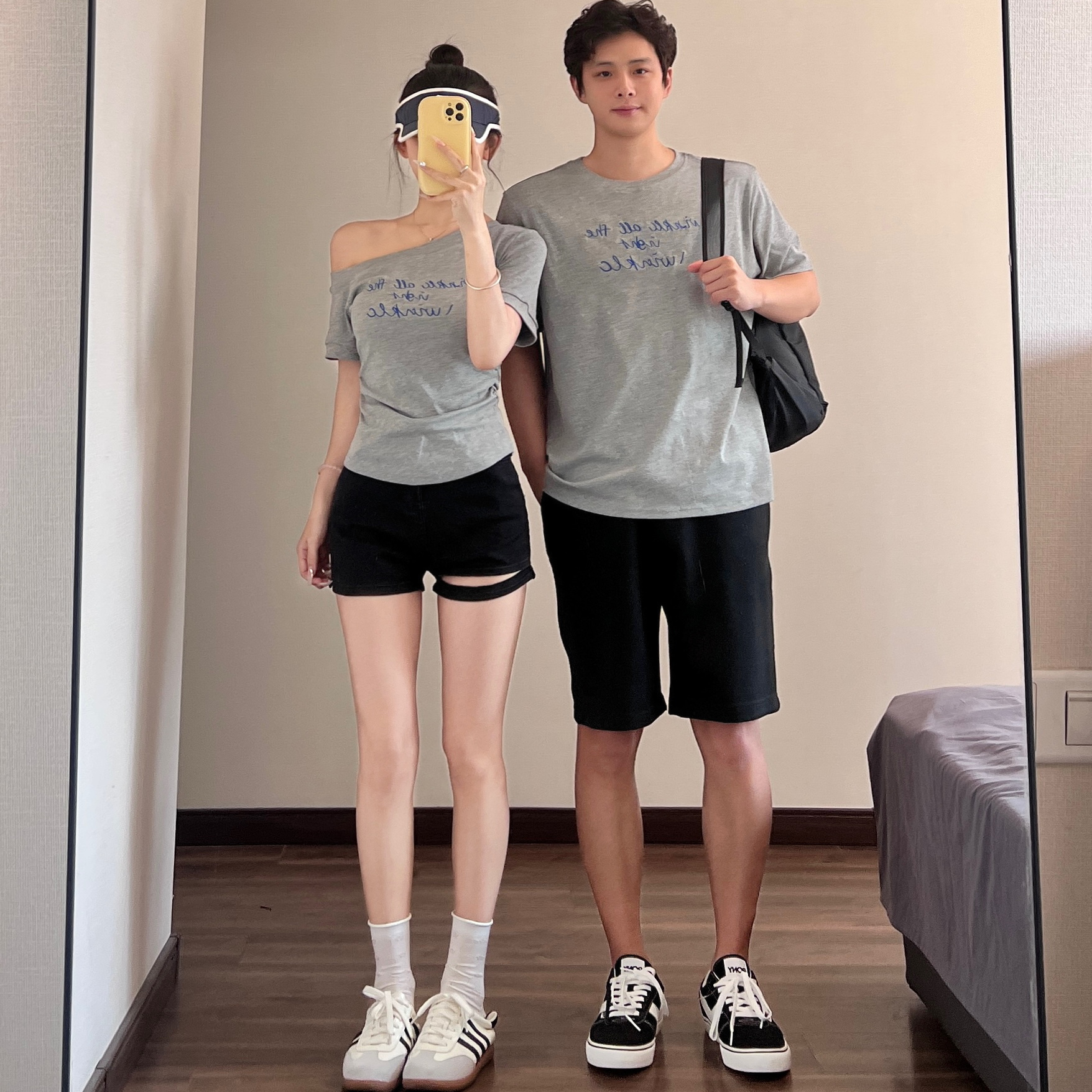 夏季 高级感2025新款 潮 t恤一长一短简约小众斜肩短袖 多巴胺情侣装