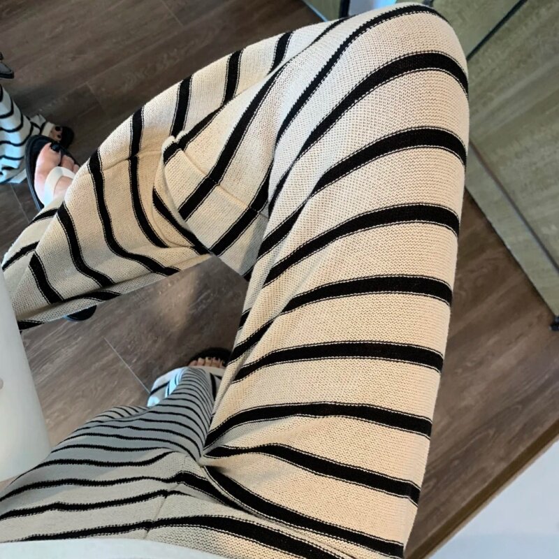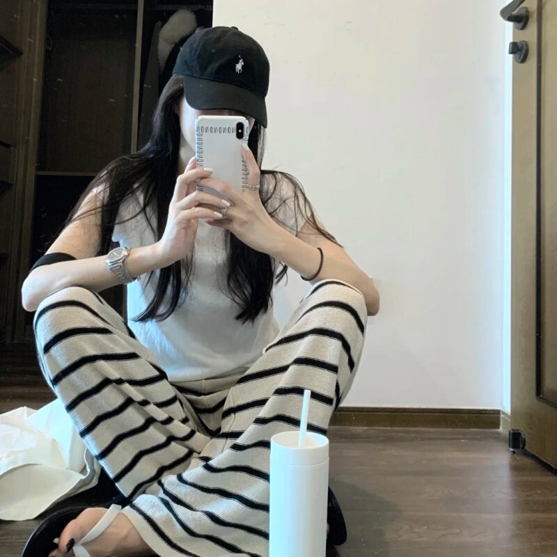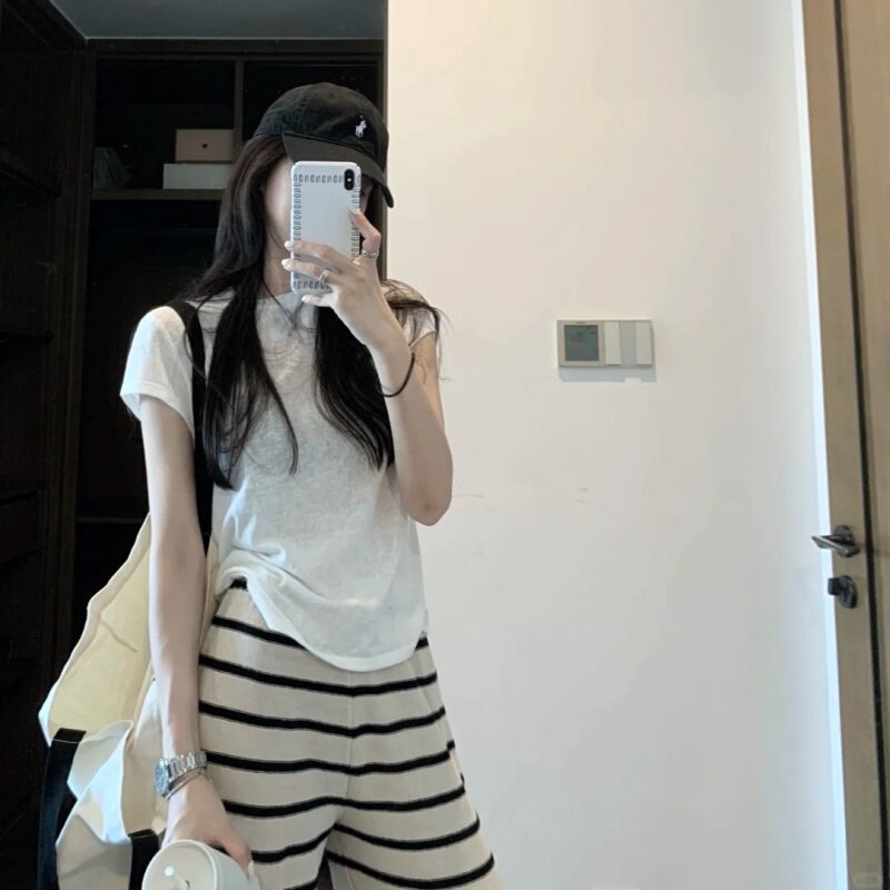 女 套装 韩系慵懒风休闲百搭圆领白色短袖 上衣高腰设计感条纹阔腿裤