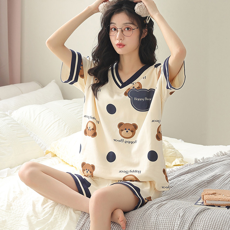 奶乎乎小熊ins风家居服套装 卡之恋睡衣女夏天纯棉短袖 V领纯棉短裤