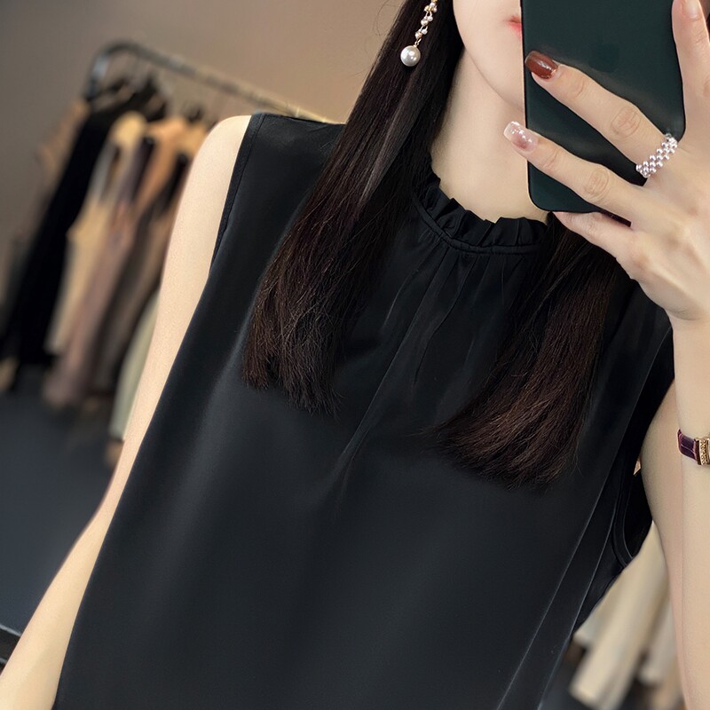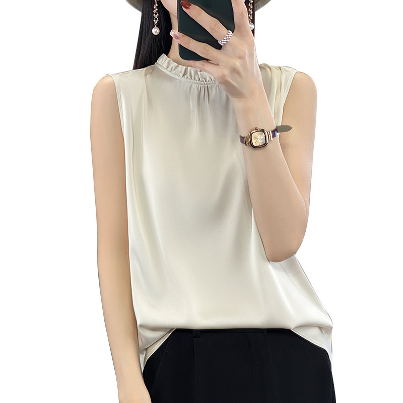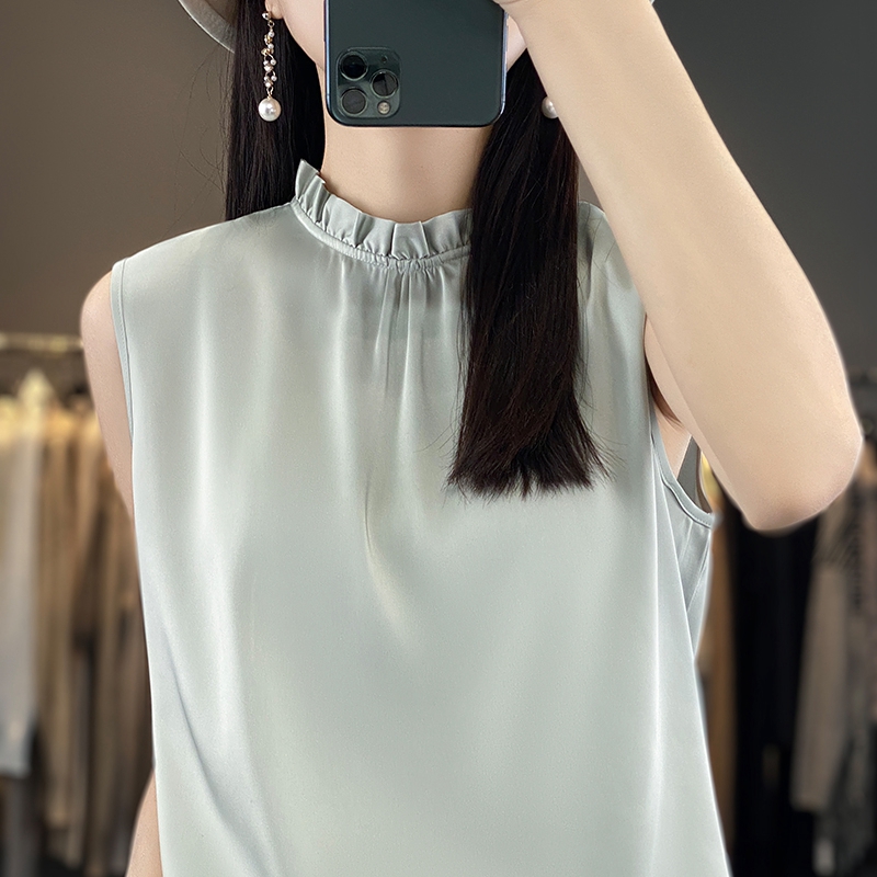 宽松内搭纯色木耳边打底衫 半高领真丝吊带背心女无袖 上衣 新款 夏季