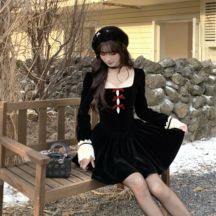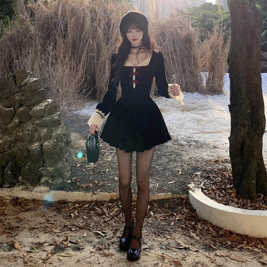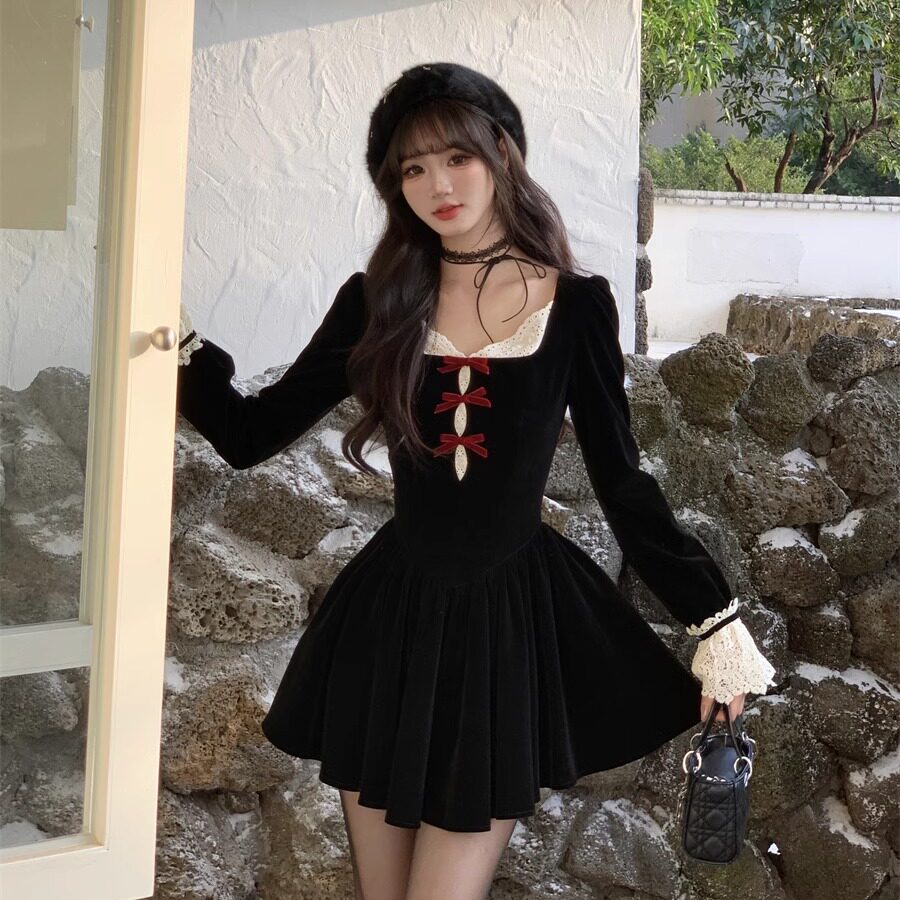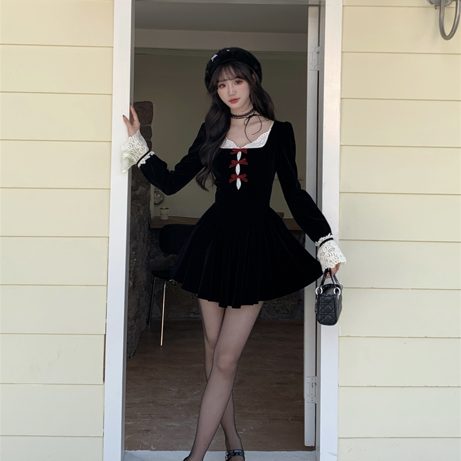 黑色丝绒连衣裙女秋冬蕾丝拼接千金礼裙 法式 越韩小鱼 洛keke少女