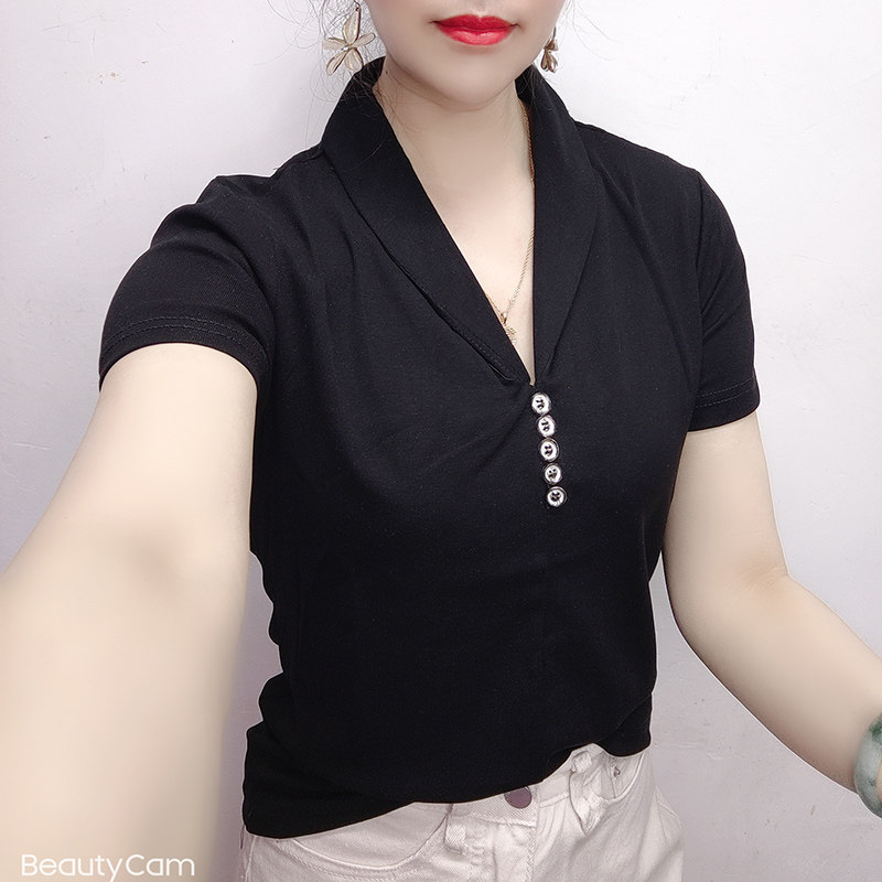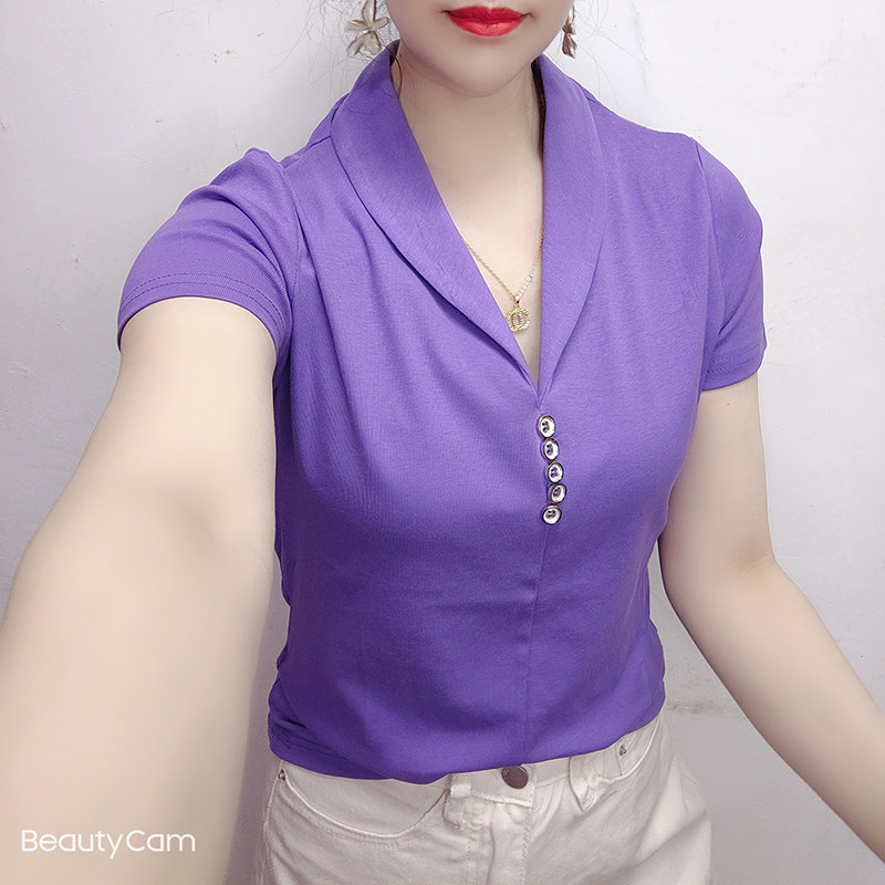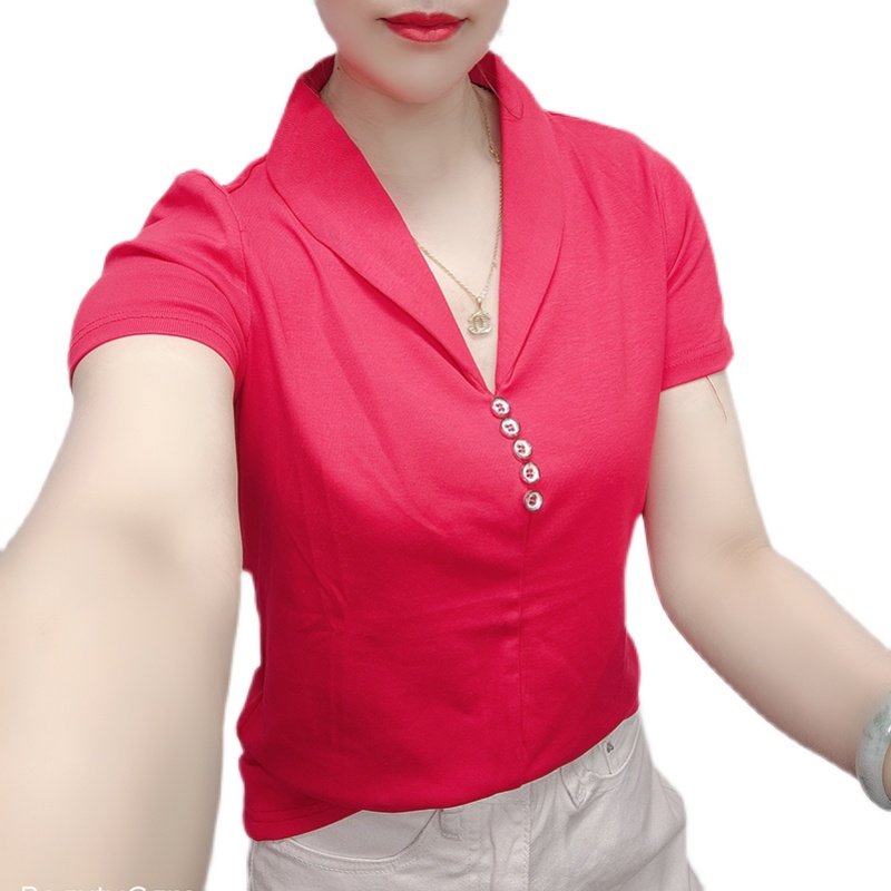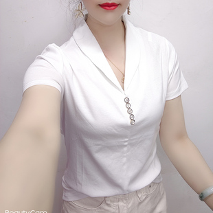 上衣外穿套头女衫 短袖 2024洋气翻领粉色V领体恤修身 夏季 t恤女新款