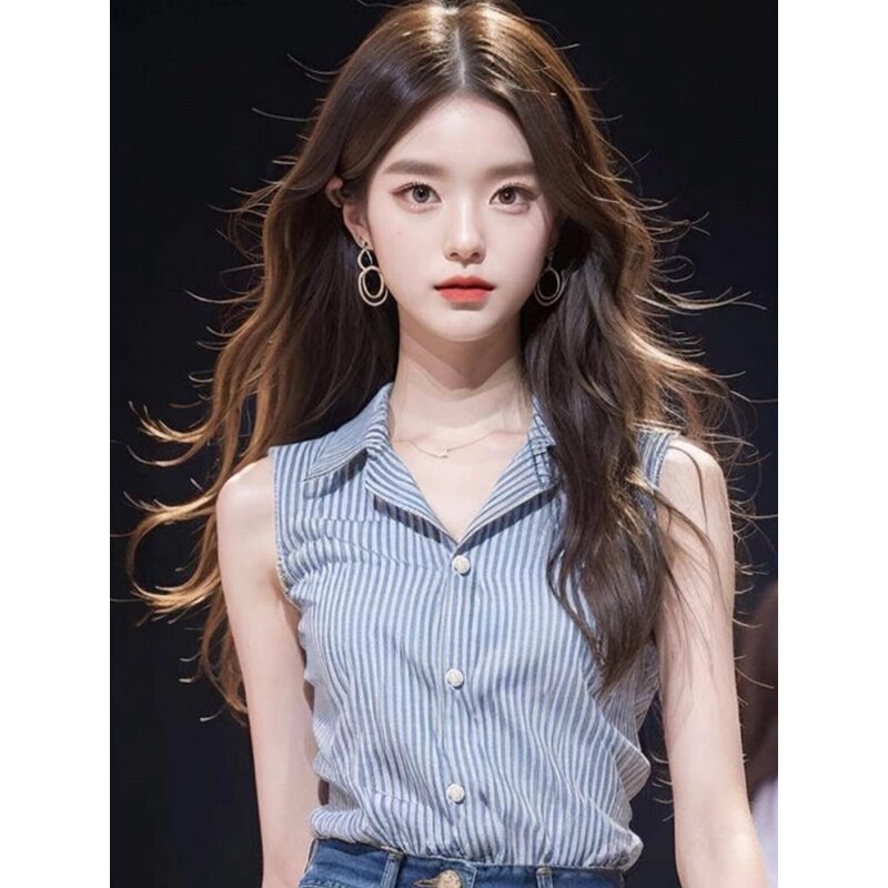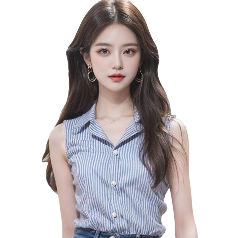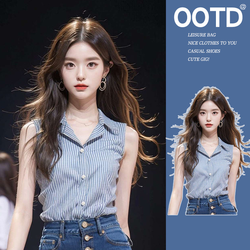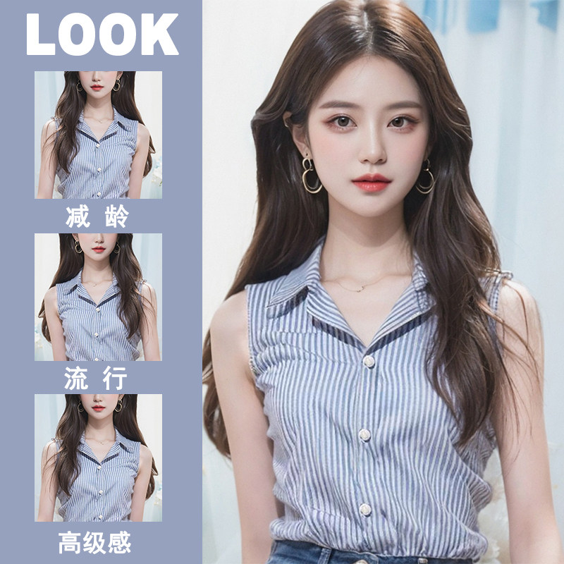 秋季 条纹衬衫 坎袖 上衣女高级感衬衣领内搭西服打底衫 背心女 女无袖