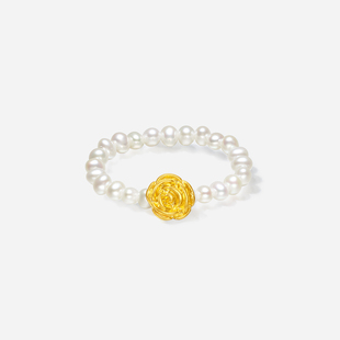 周六福黄金珍珠戒指女款 5d硬金玫瑰花弹力绳女戒黄金镶嵌官方礼物