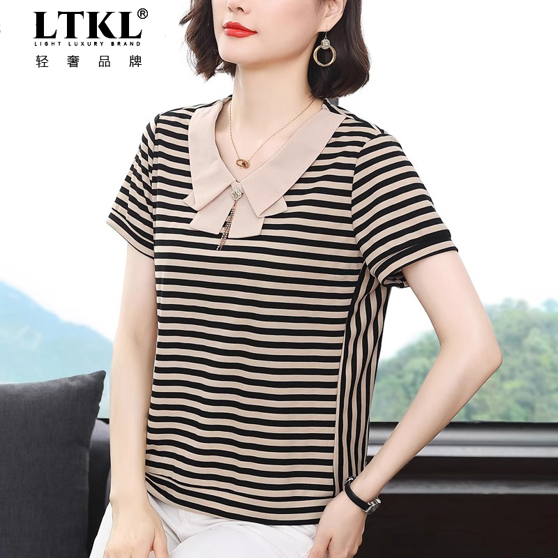 宽松半袖 妈妈夏装 中年洋气大码 t恤女2025新款 棉上衣潮 条纹短袖