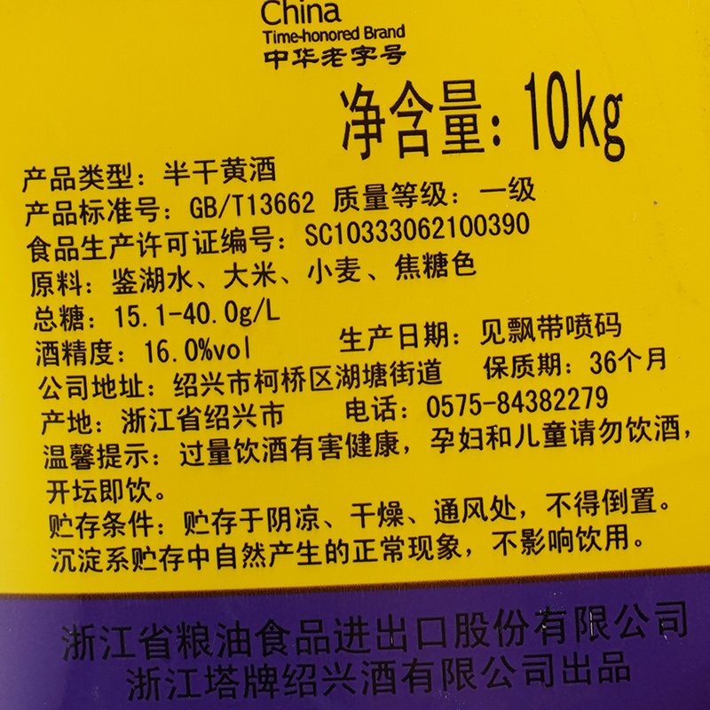 塔牌三年陈年加饭酒10kg坛装 黄酒20斤手工冬酿花雕酒正宗绍兴老酒