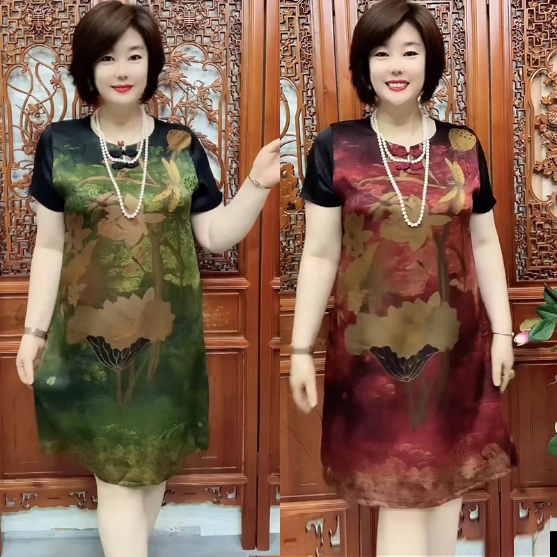 大码 夏季 真丝旗袍裙中老年妈妈桑蚕丝连衣裙宽松时尚 短袖 裙子 新款