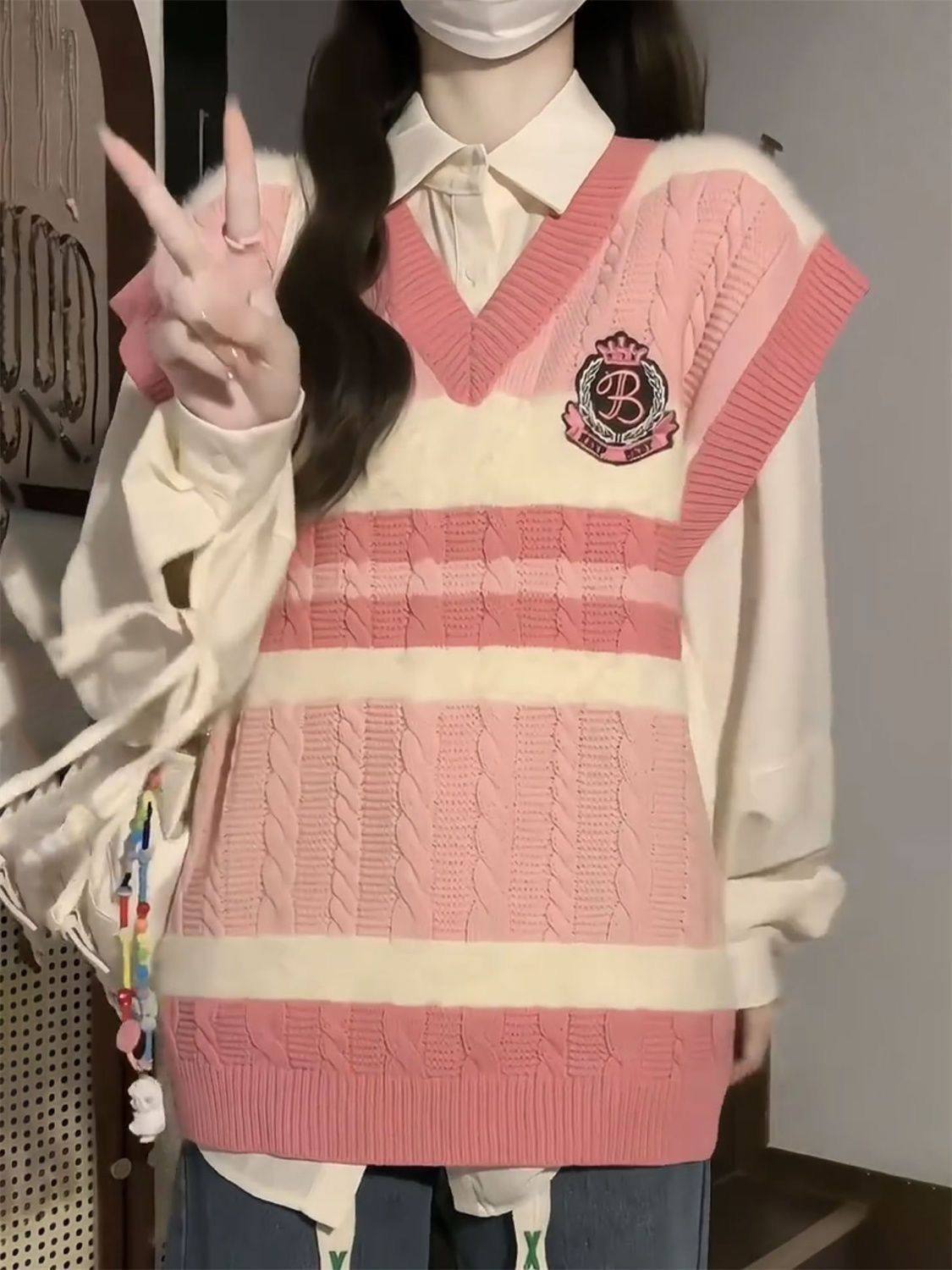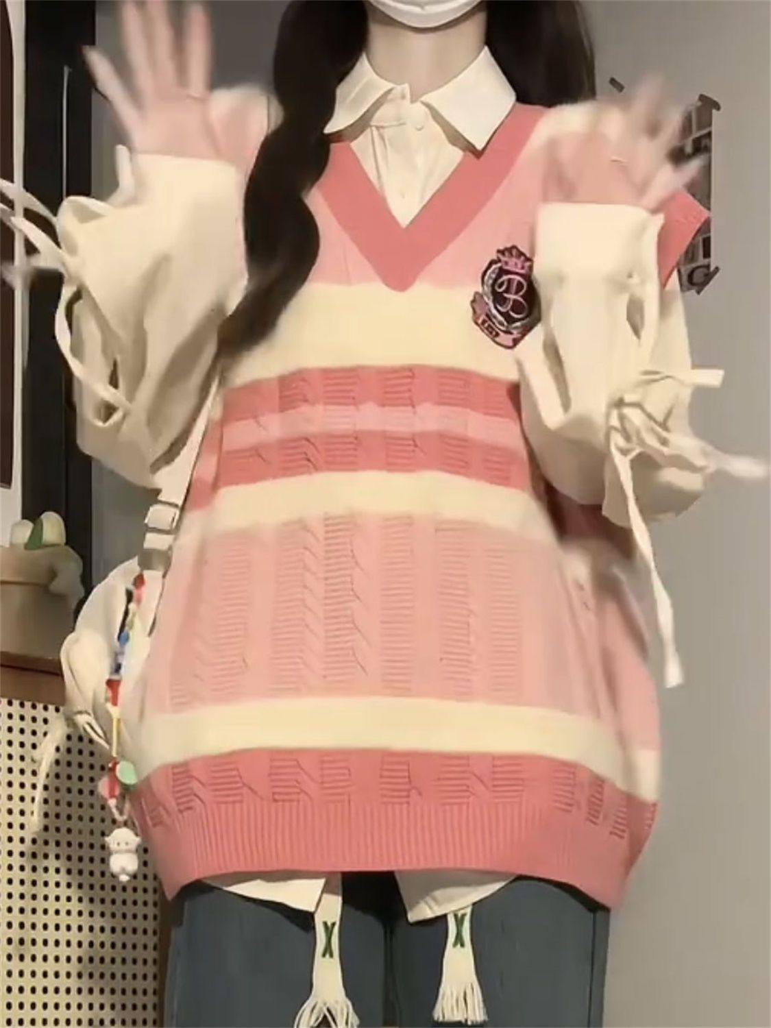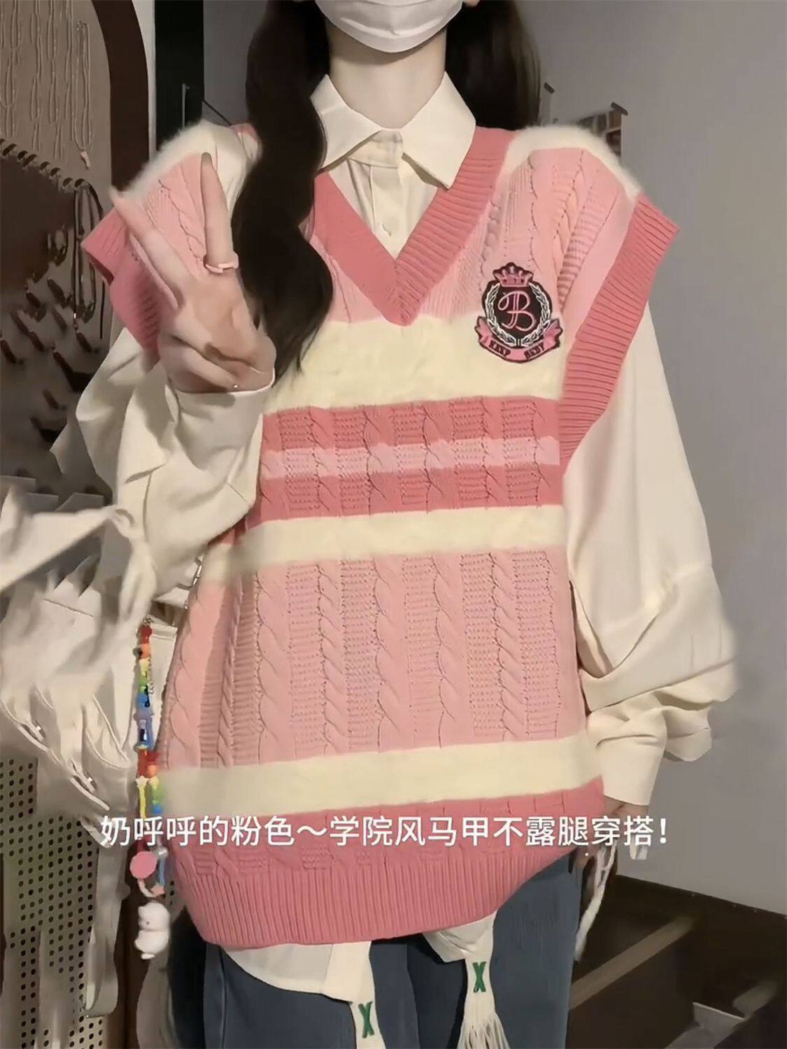 杏色纯色衬衫 早秋甜美多巴胺条纹拼色毛衣背心针织马甲 套装 两件