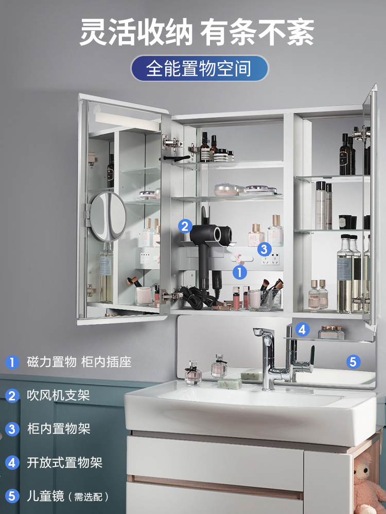 浴室镜柜简约挂墙式 镜箱收纳分层架洗手间梳妆防水镜子卫生间