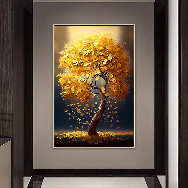网红轻奢发财树玄关装 饰画入户正对门走廊过道尽头挂画高级感玄幻