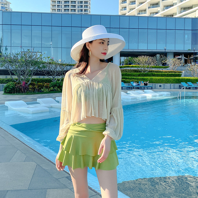 保守温泉泳装 游泳衣女2025新款 高级感分体三件套微胖女孩遮肚大码