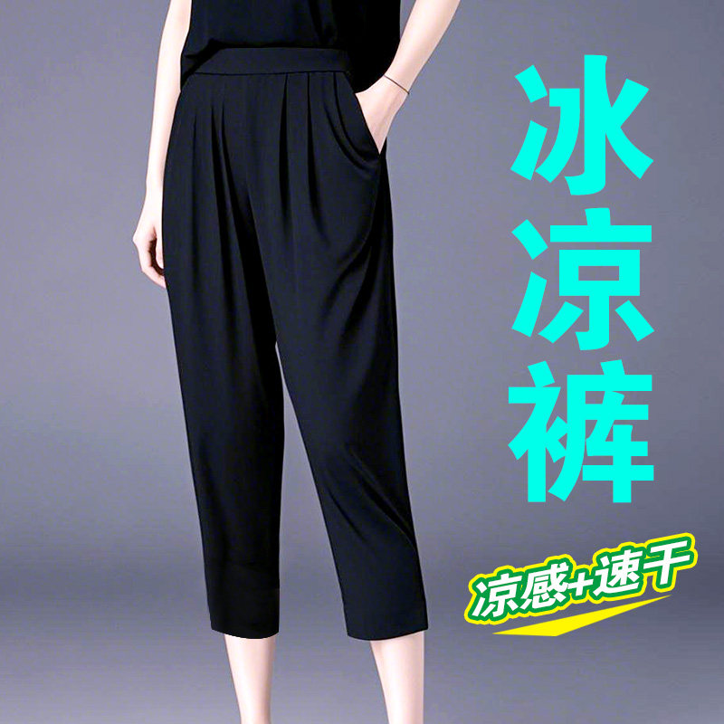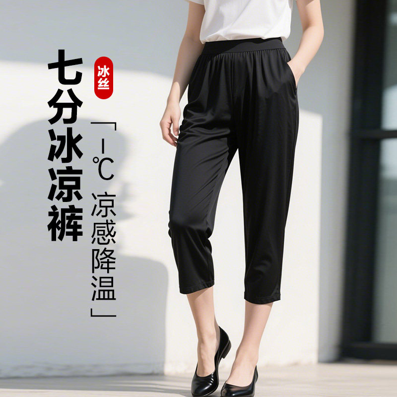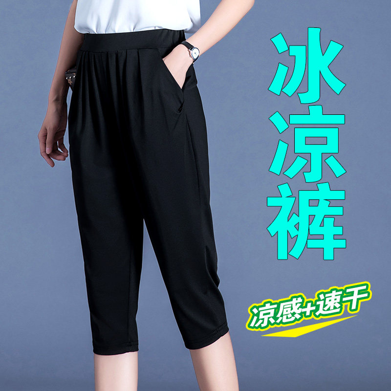 中年女士7分裤 七分裤 胖mm松紧弹力腰宽松显瘦大码 冰丝薄款 女夏季