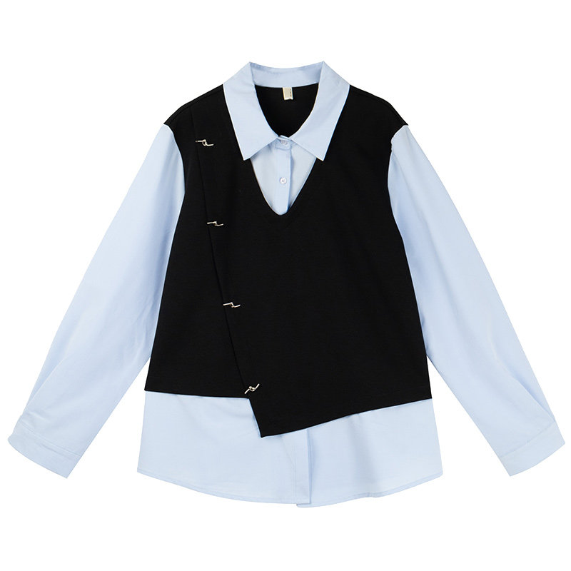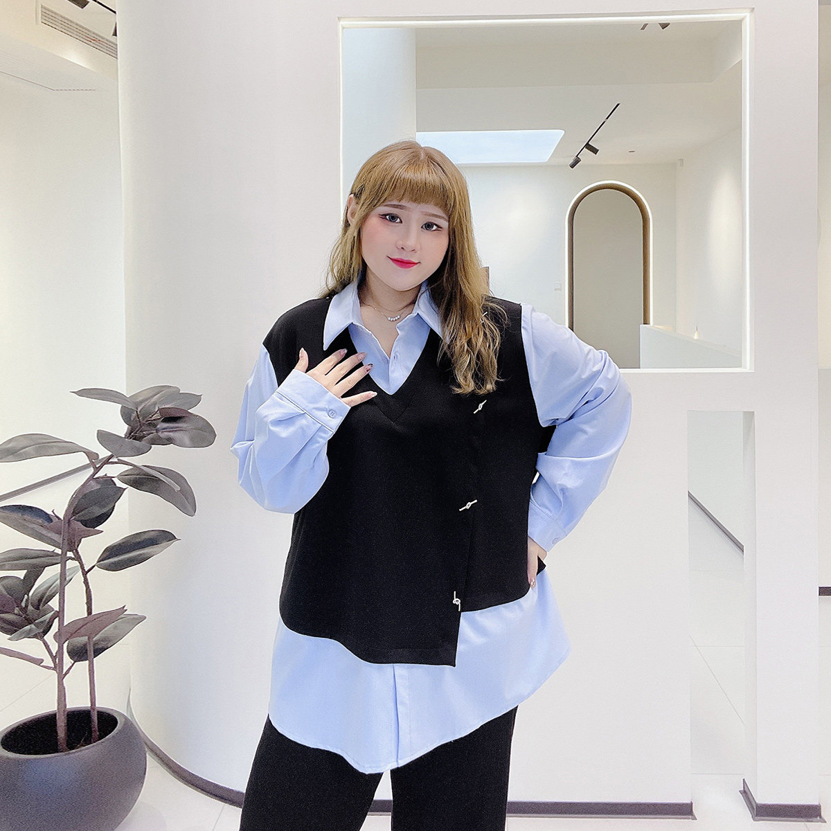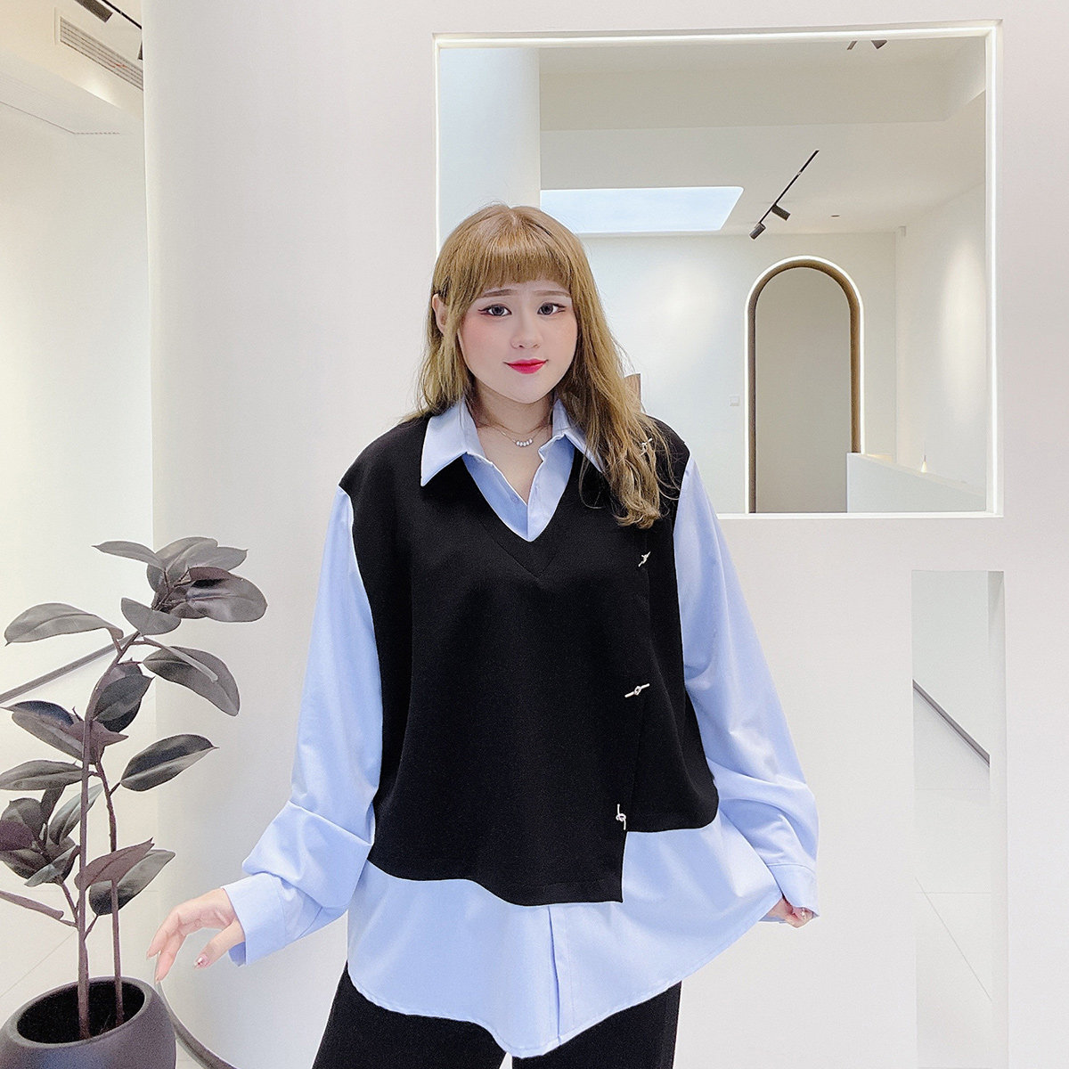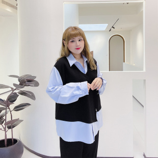 显瘦百搭假两件针织马甲衬衫 胖mm春装 女装 时髦通勤胖仙女莹莹大码