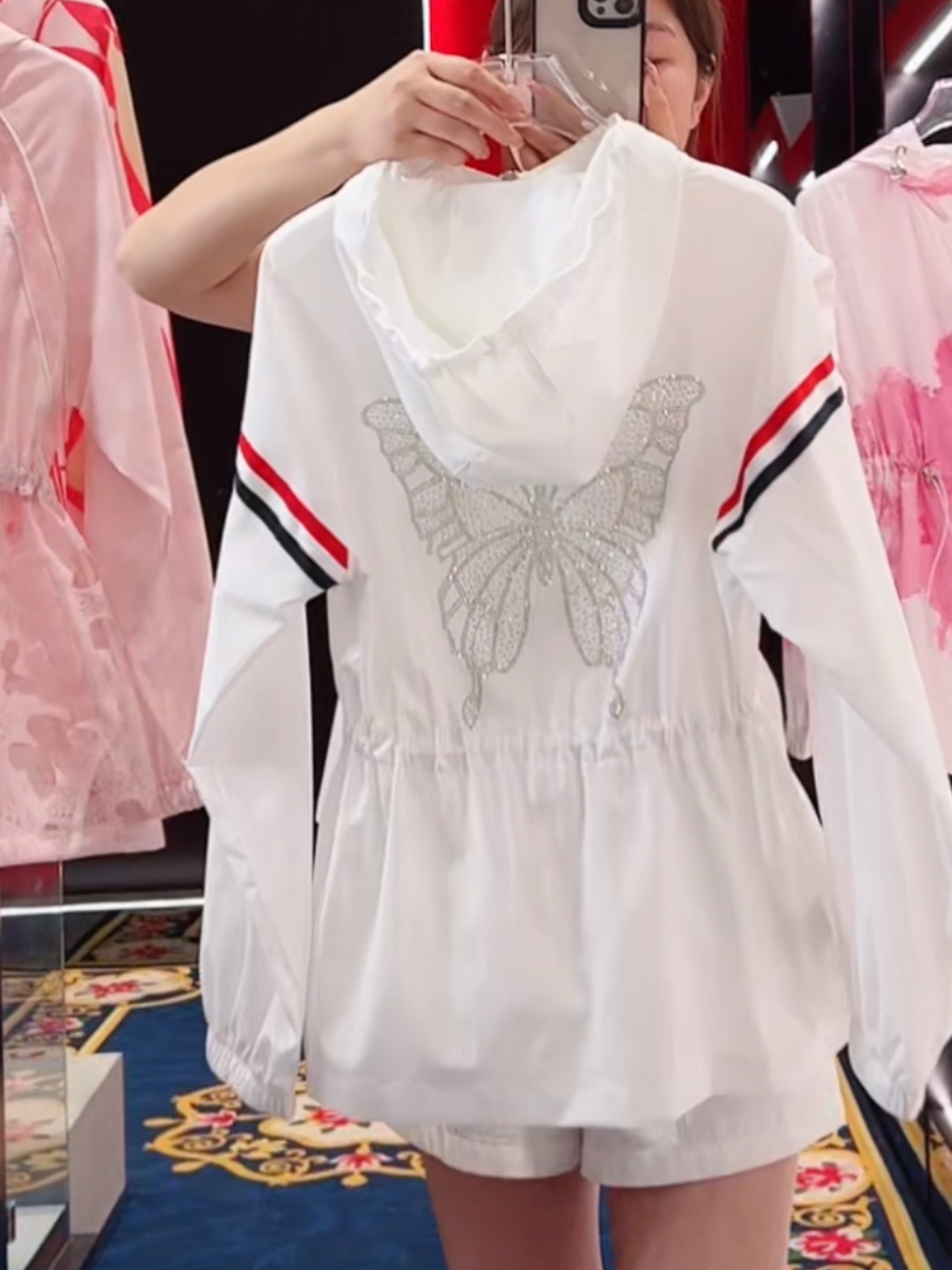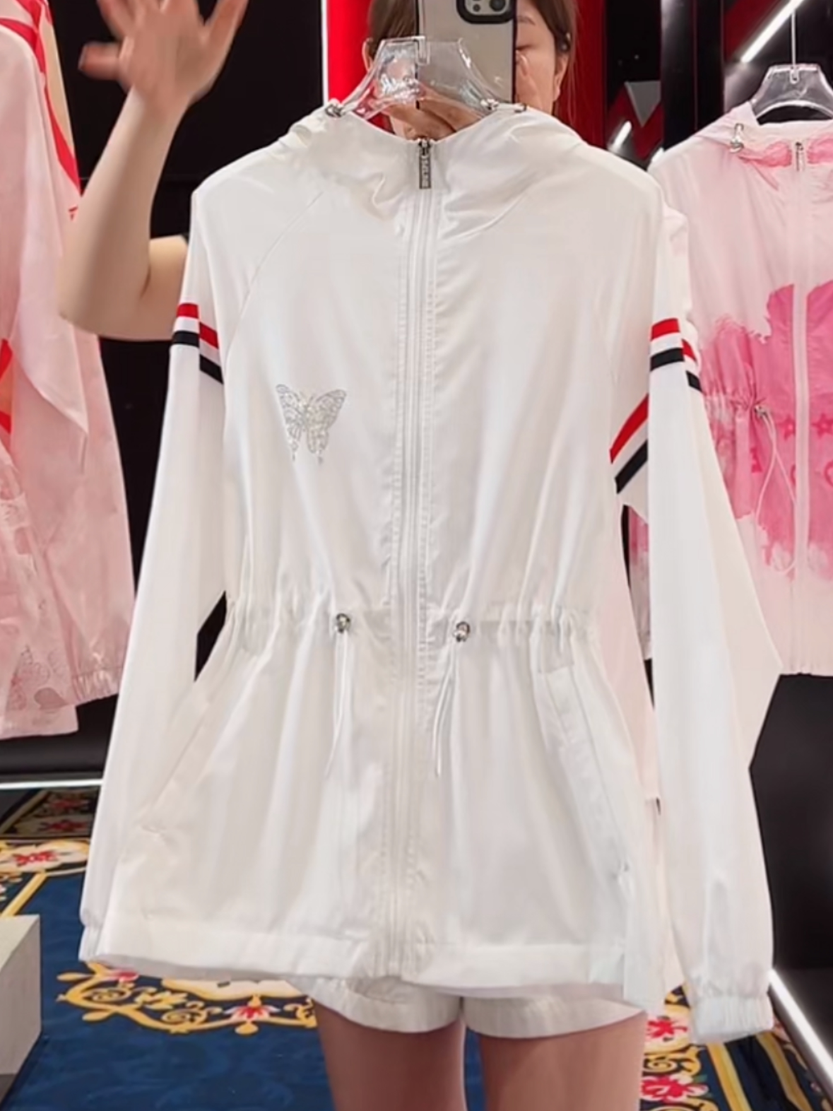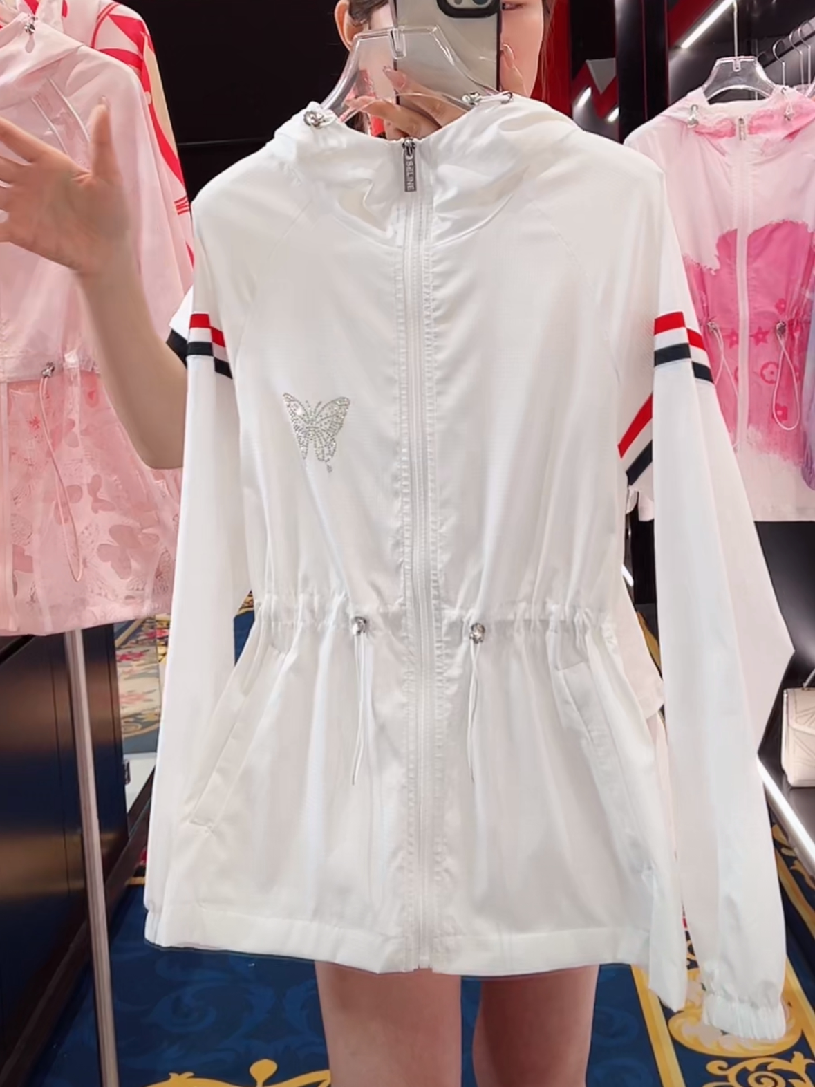 时尚 外套女2024新款 收腰外出白防晒衣轻薄 两条杠连帽烫钻长袖 夏季