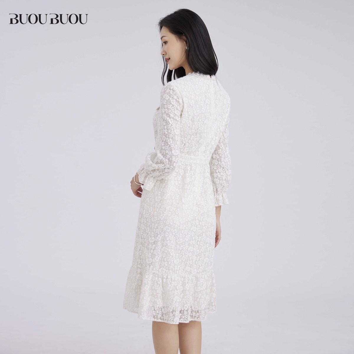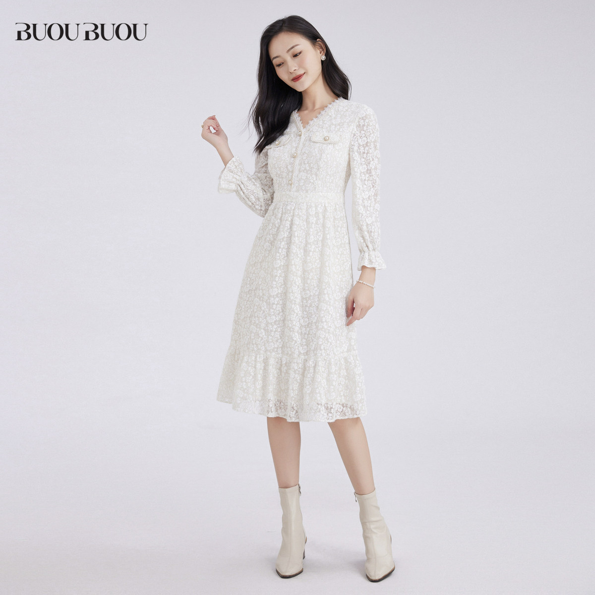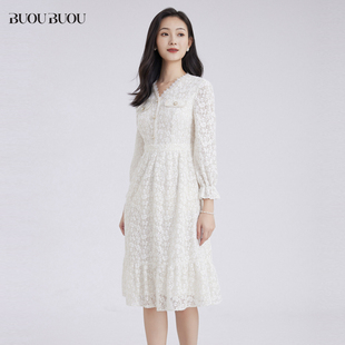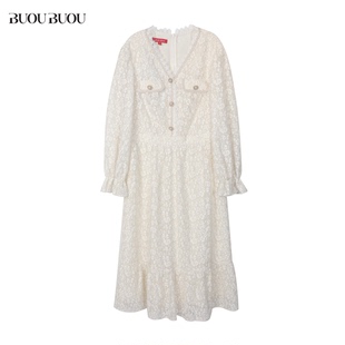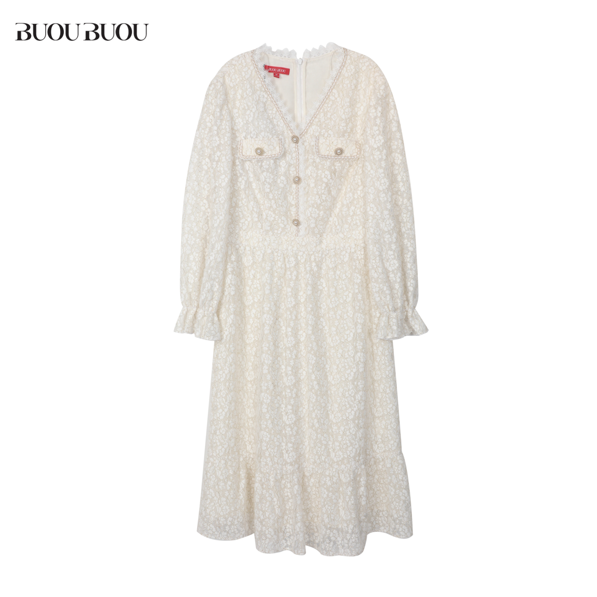V领珍珠扣蕾丝连衣裙女初秋DJ3G029 BuouBuou新中式 关注领券