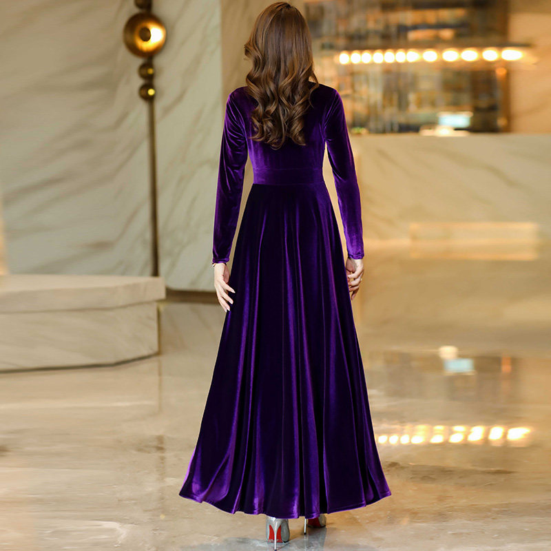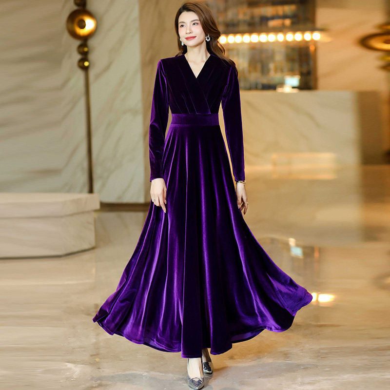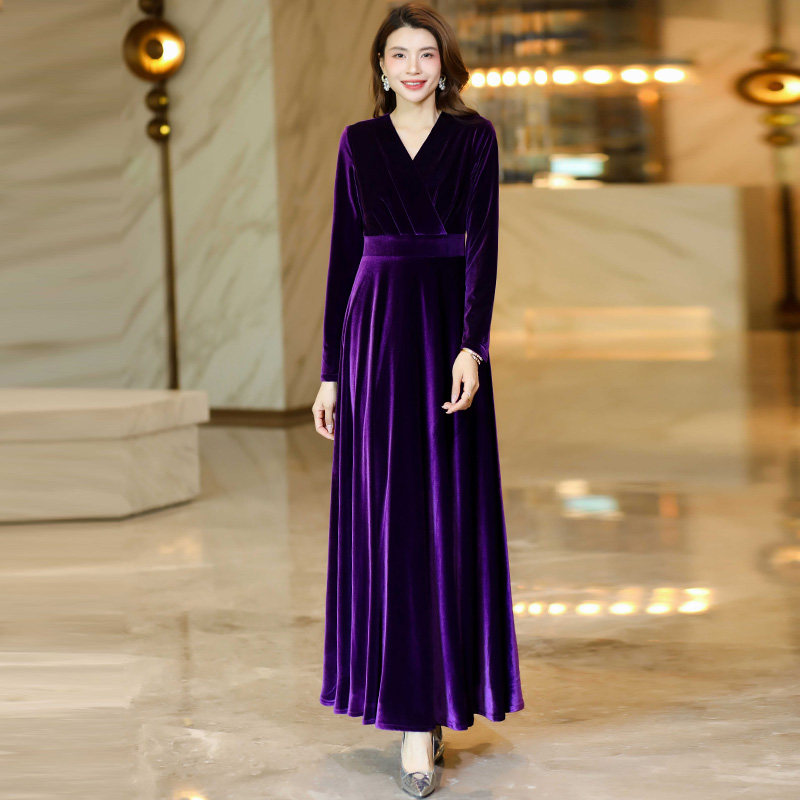 修身 V领纯色丝绒连衣裙妈妈款 显瘦小个子长裙子 秋冬长袖 2025新款