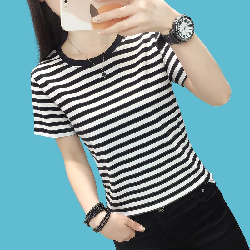 女t恤新款 百搭体恤衫 夏装 中年妈妈条纹半袖 宽松上衣大码 纯棉短袖
