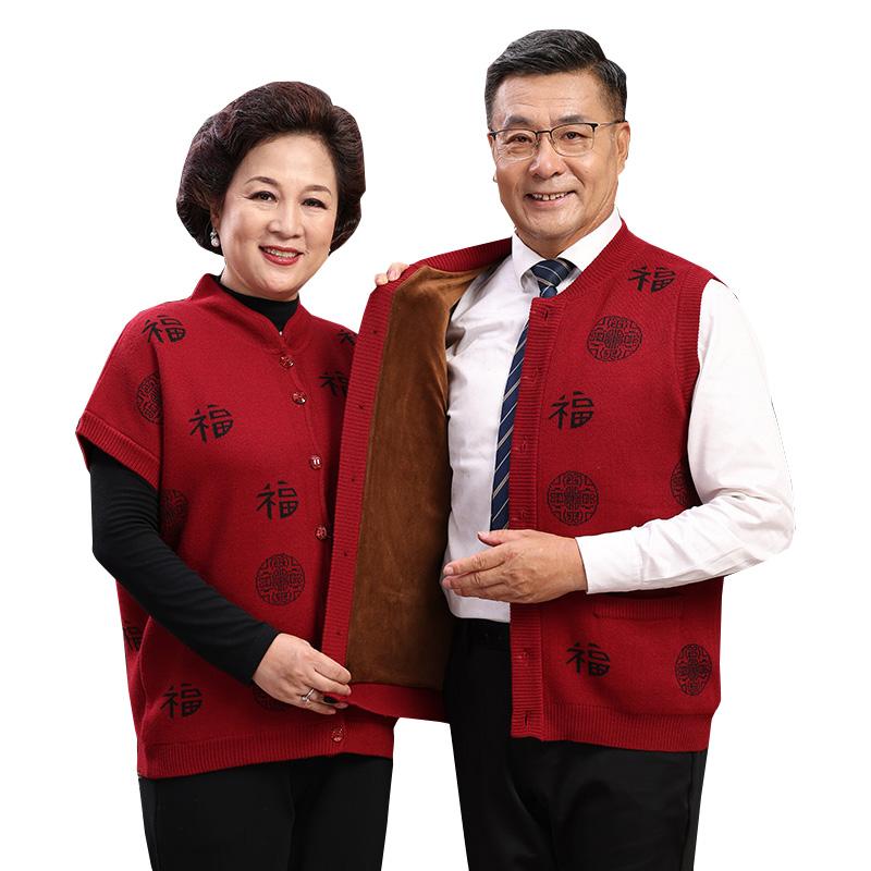 背心老年人针织短袖 福字情侣羊毛衫 中老年爸爸妈妈装 秋冬马甲开衫