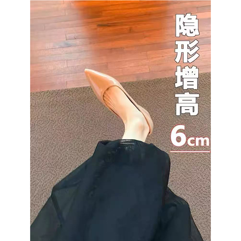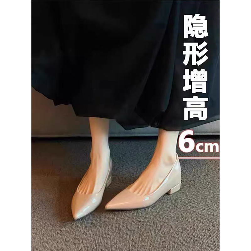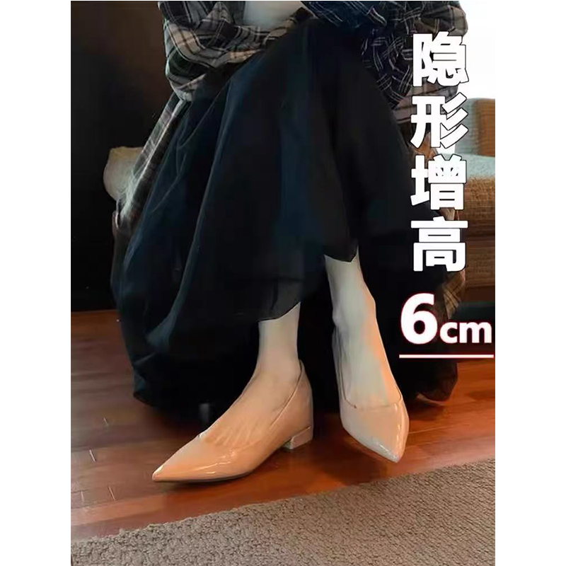 子内增高一脚蹬百搭通勤女鞋 女浅口鞋 裸色尖头粗跟单鞋 春秋法式