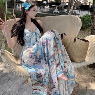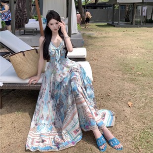 波西米亚风v领吊带连衣裙女夏季 海边度假裙宽松长裙气质高腰裙子
