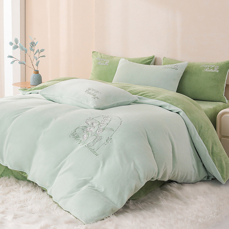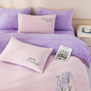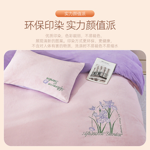 梦洁家纺正品 秋冬加厚牛奶绒珊瑚绒被套床单素色绣花三四件套248