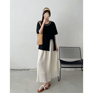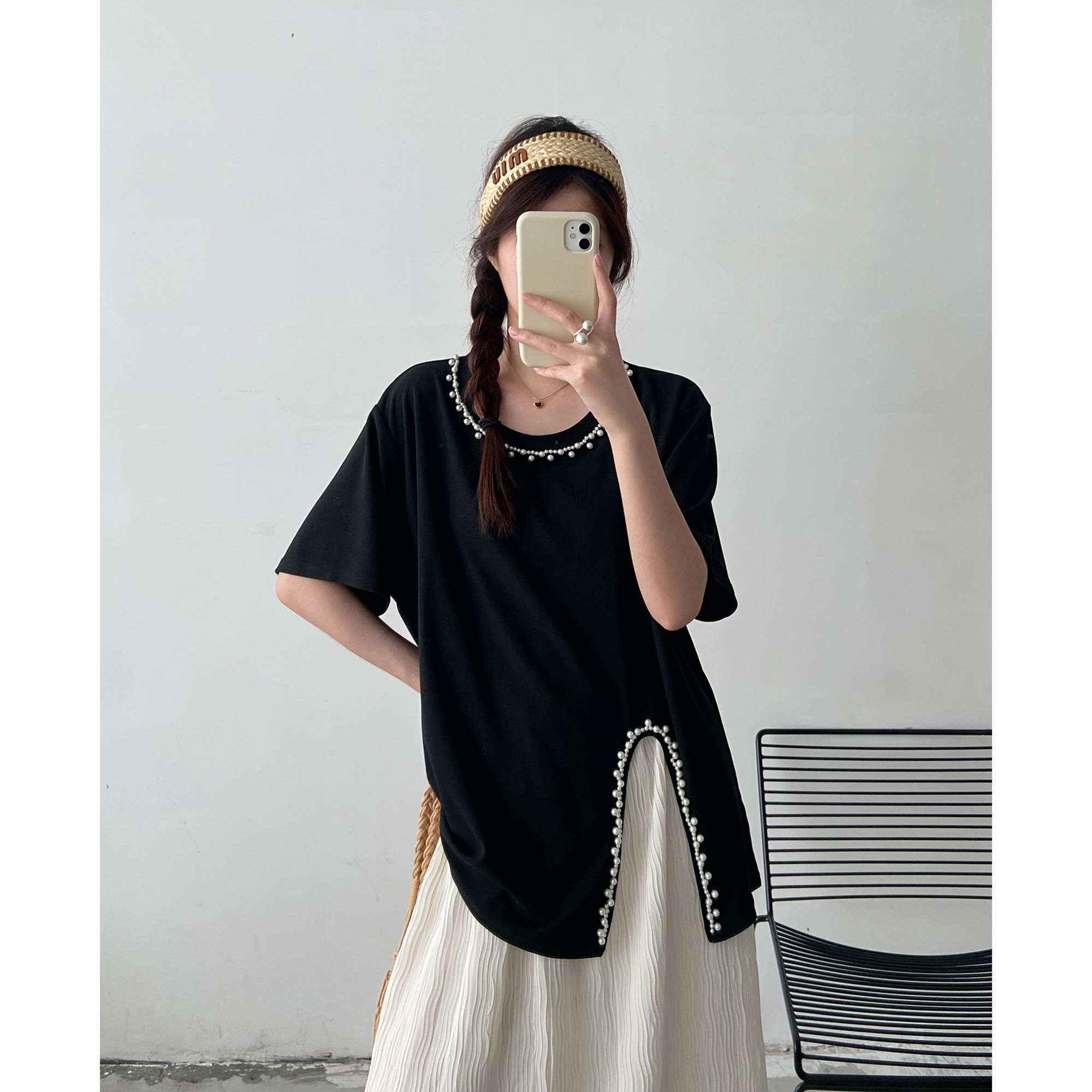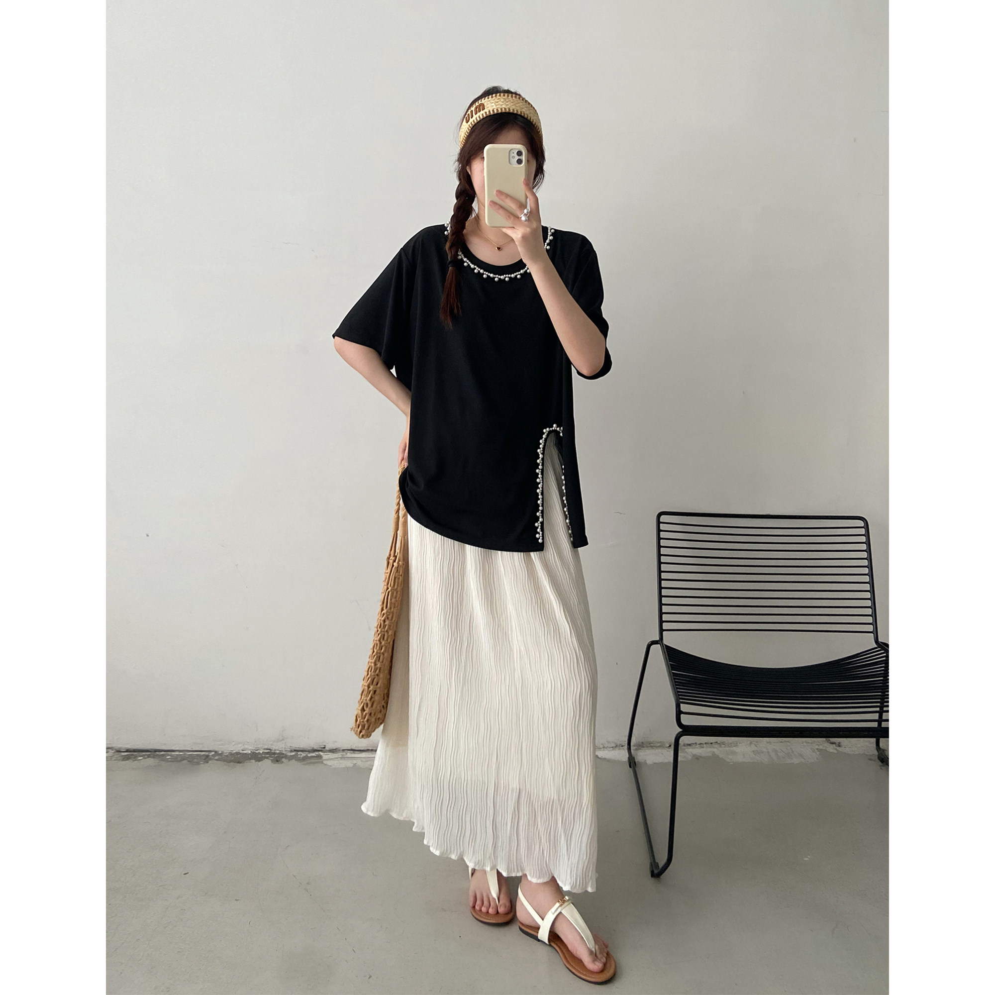 T恤上衣两件套宽松显瘦半身裙套装 开叉珍珠短袖 潮 新款 胖妹妹夏装