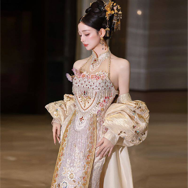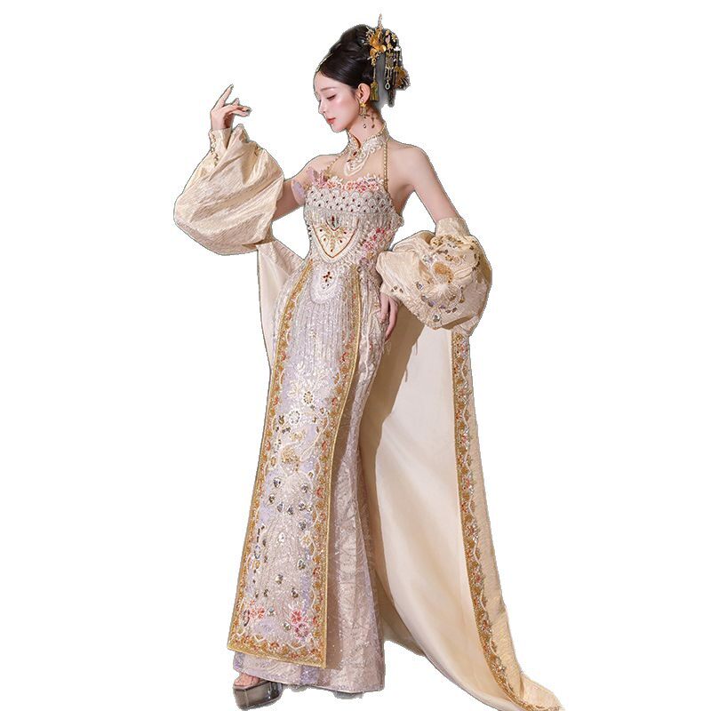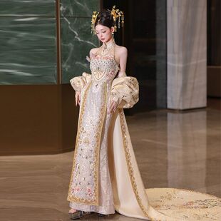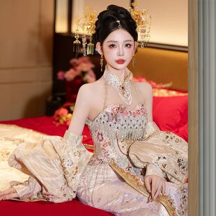 高定香槟色秀禾服大拖尾旗袍2025年新款 订婚礼服新娘结婚服晚宴服