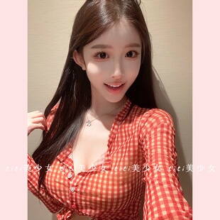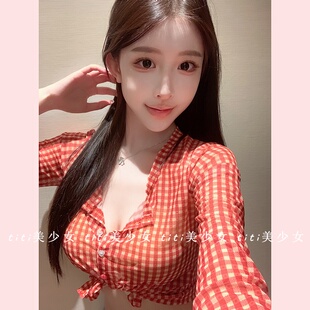 TiTi美少女 新款 纯欲风网纱长袖 春季 性感紧身上衣 格子防晒衬衫