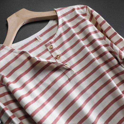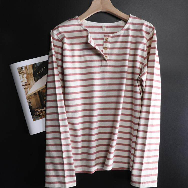复古宽松棉 T恤女春半门襟打底衫 法式 复古厚实polo领红白条纹长袖