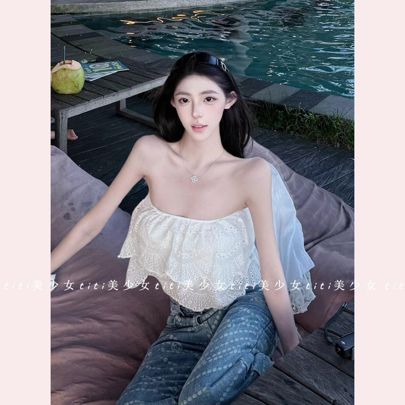 休闲女秋季 嗲妹时尚 法式 镂空刺绣白色裹胸上衣女装 TiTi美少女