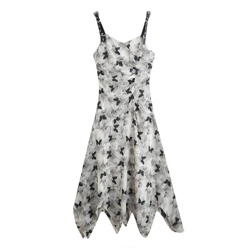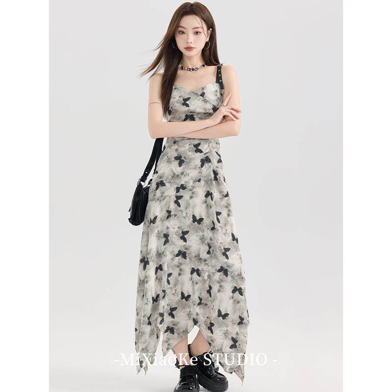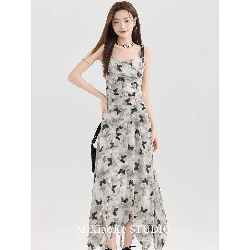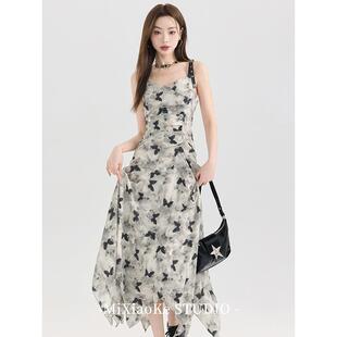 芈小可法式 气质长裙不规则裙子小个子 水墨画碎花吊带连衣裙女夏季