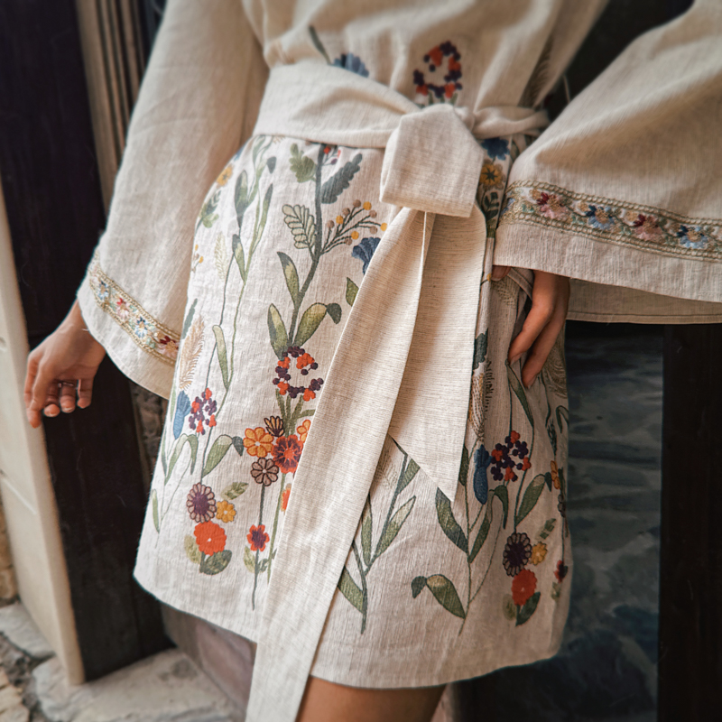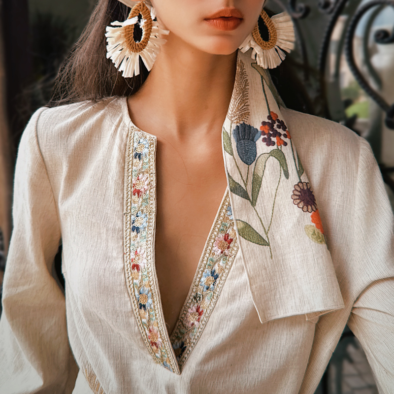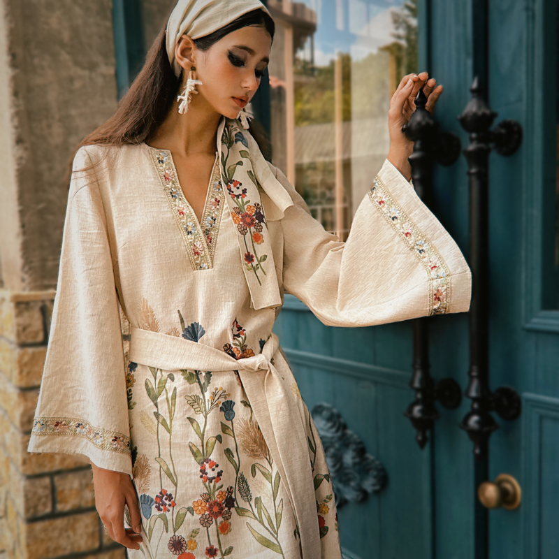 粉红大布娃娃高级感气质V领收腰印花裙子女喇叭袖 连衣裙2025秋新