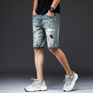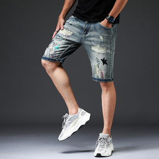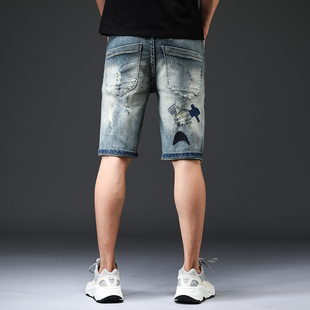 男韩版 中裤 潮流个性 修身 潮牌 绣花五分牛仔裤 刺绣破洞补丁牛仔短裤