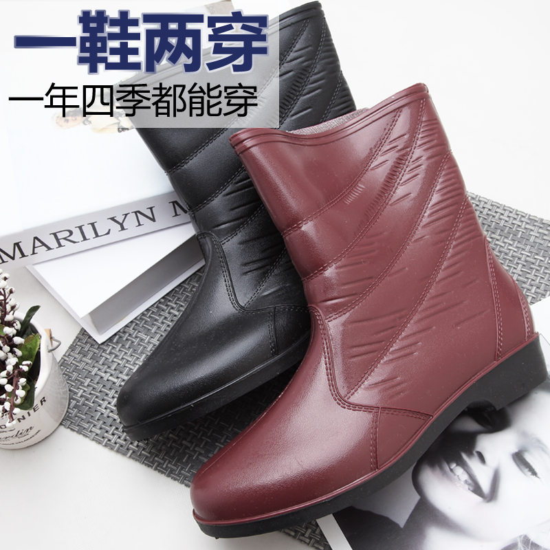 包邮 中筒防滑水鞋 雨鞋 雪地雨靴防水胶鞋 加棉加绒 女纯色韩版 正品
