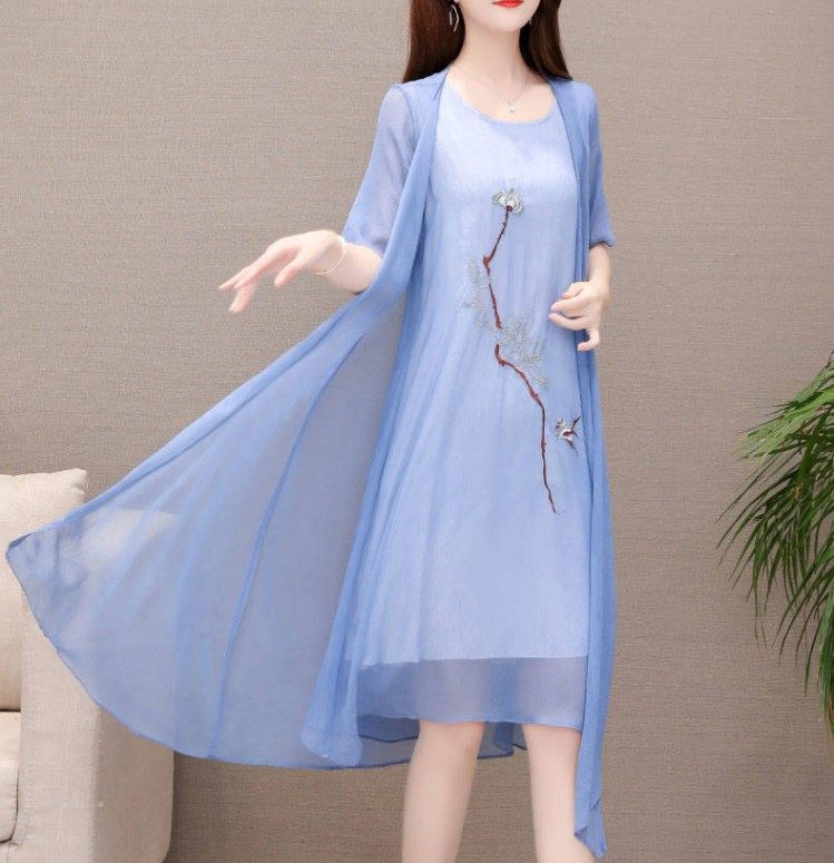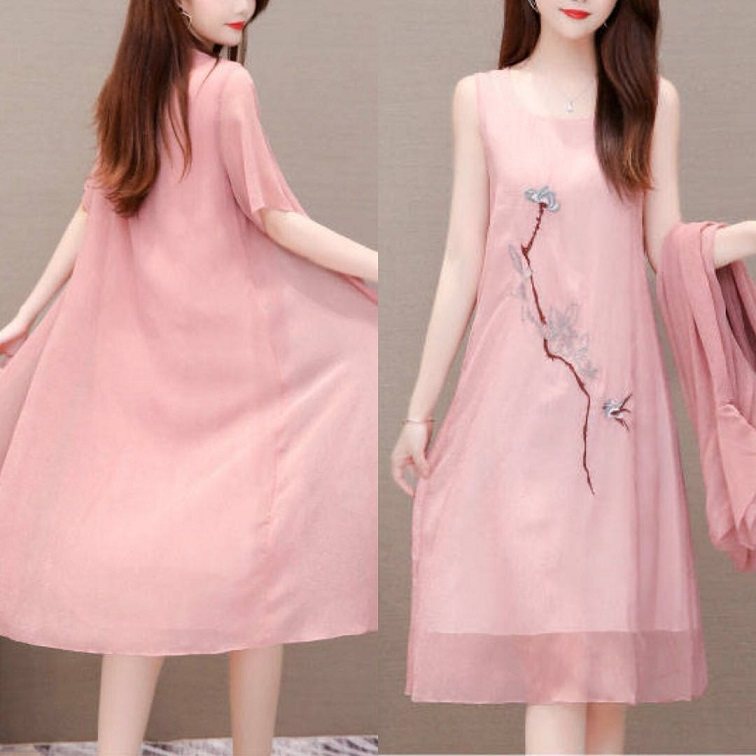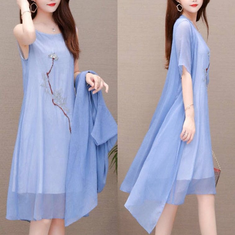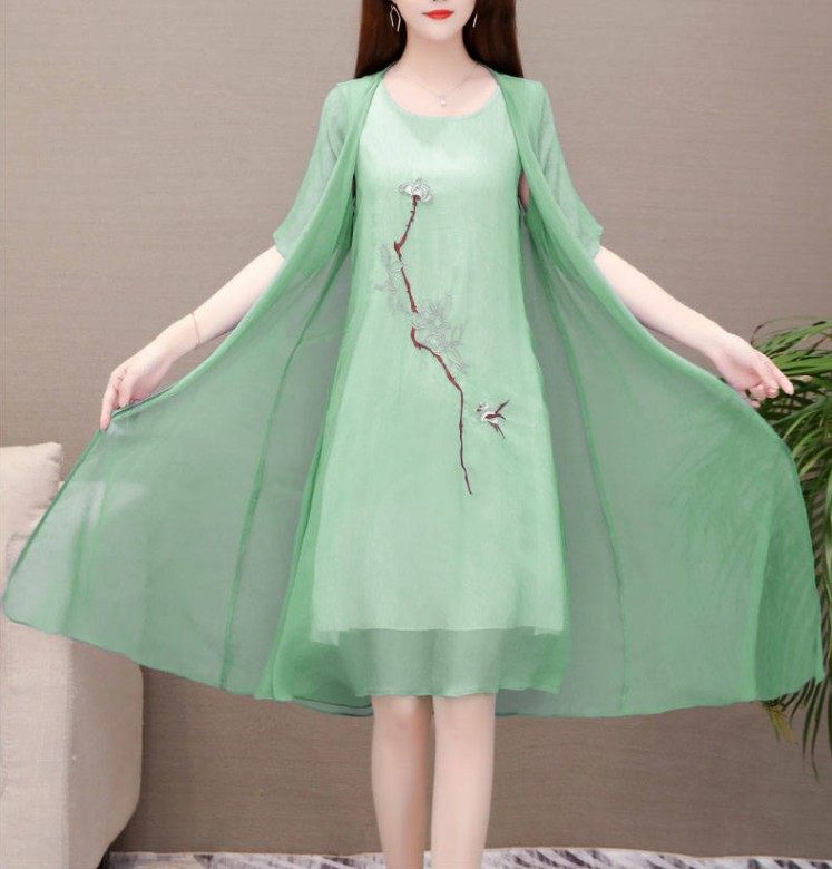 遮肚显瘦雪纺连衣裙女 绣花气质汉服中长款 两件套2025夏新款 大码