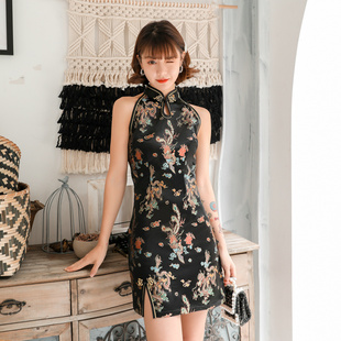 织锦缎旗袍性感露肩改良时尚 超短旗袍连衣裙走秀活动演出旗袍礼服