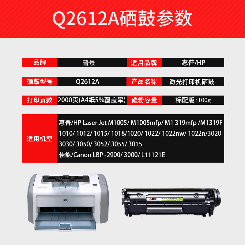 1020墨粉打印机墨盒m1005mfp 1020PLUS易加粉晒鼓HP12A M1319f碳粉盒2612A兼容硒鼓 LaserJet 普景适用惠普HP