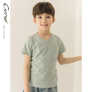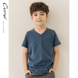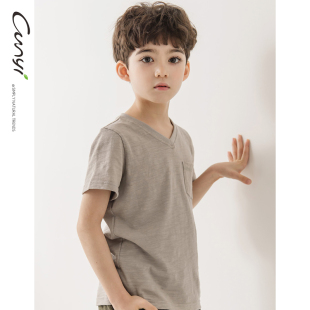 夏装 T恤2020新款 中大童纯色打底纯棉体恤 男童V领短袖 纯一良品童装
