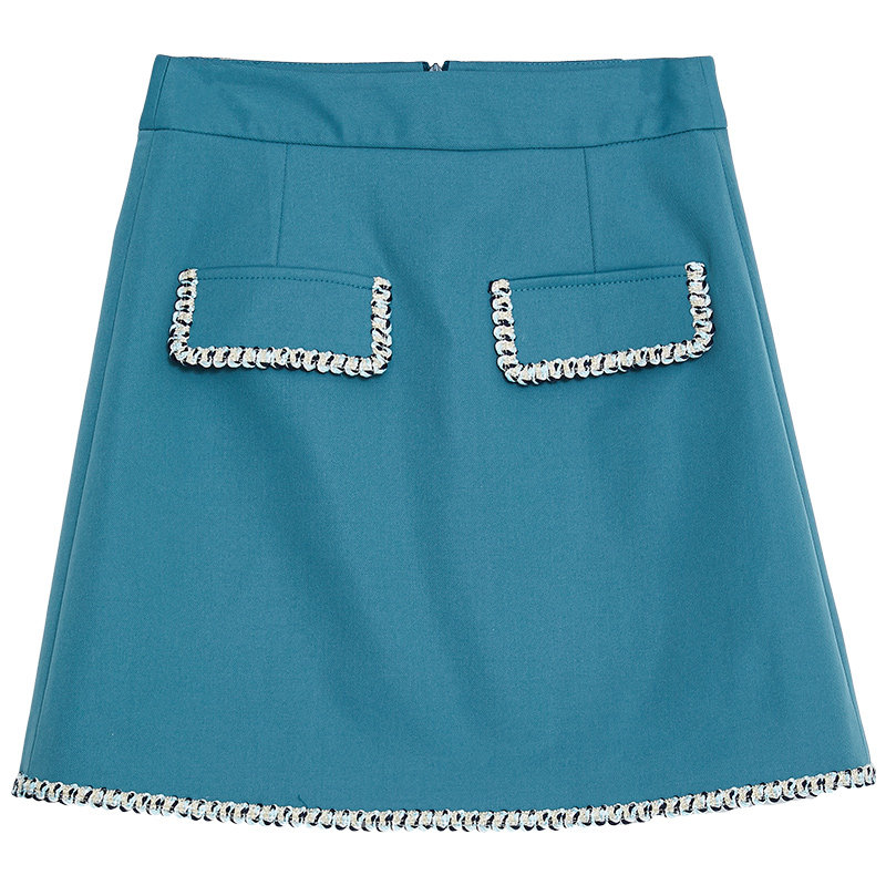 甜心海盐蓝复古小香风个性 女装 口袋高腰短裙 新款 Oece春秋款