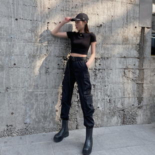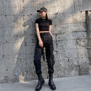 显瘦帅气黑色高腰嘻哈潮ins运动束脚裤 2025年新款 女美式 裤 子 工装