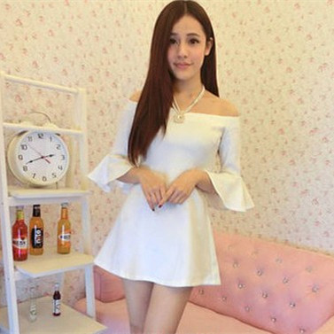 性感修身 女装 仙女纯色一字领露肩喇叭袖 大码 连衣裙 春夏新款