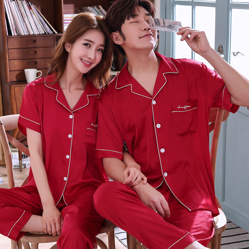 冰丝短袖 大码 长裤 喜庆红色丝绸男士 家居服 套装 结婚情侣睡衣女夏季