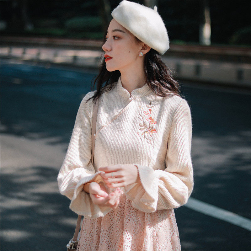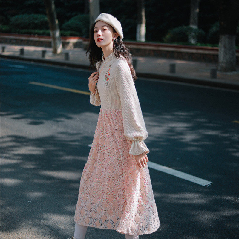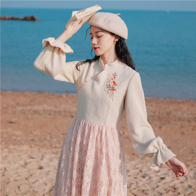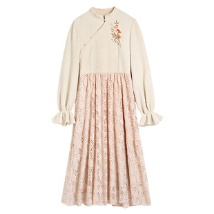 绣花针织连衣裙B 连衣裙 微笑向暖 复古下摆蕾丝拼接刺绣中长款