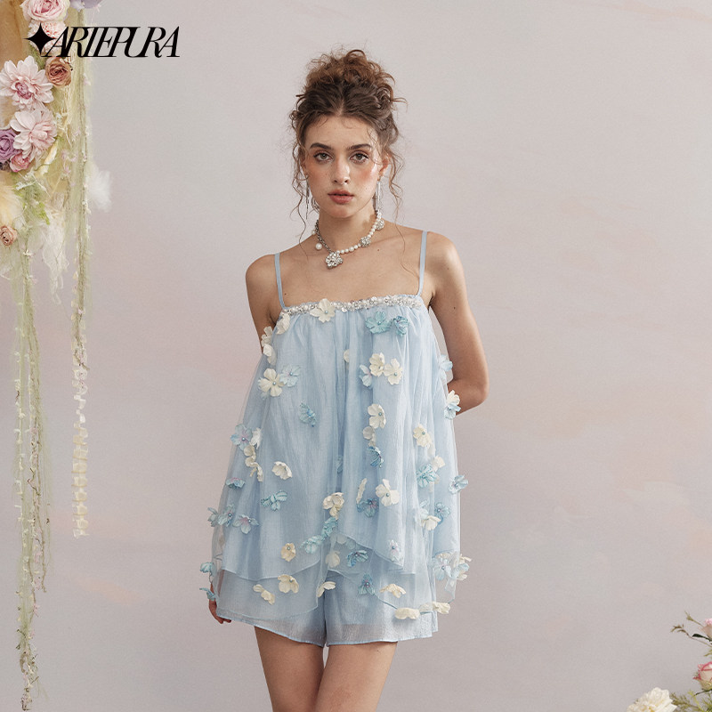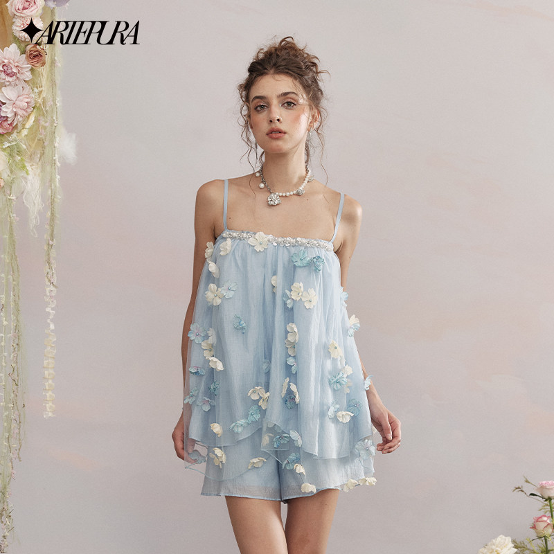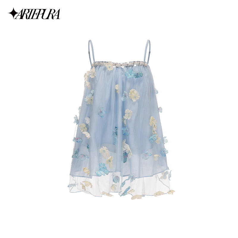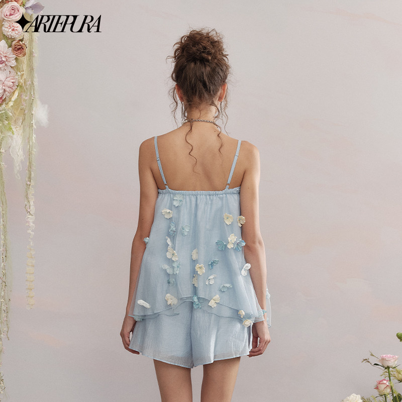 PURA蓝色立体花亮片吊带小上衣松紧短裤 ARTE 套装 赵一橙同款