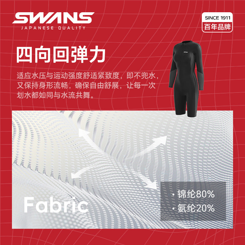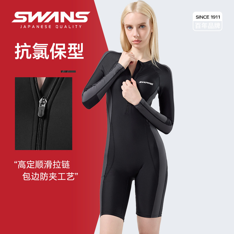女士游泳衣 五分防晒专业训练抗氯爆款 swans泳衣女款 连体温泉长袖