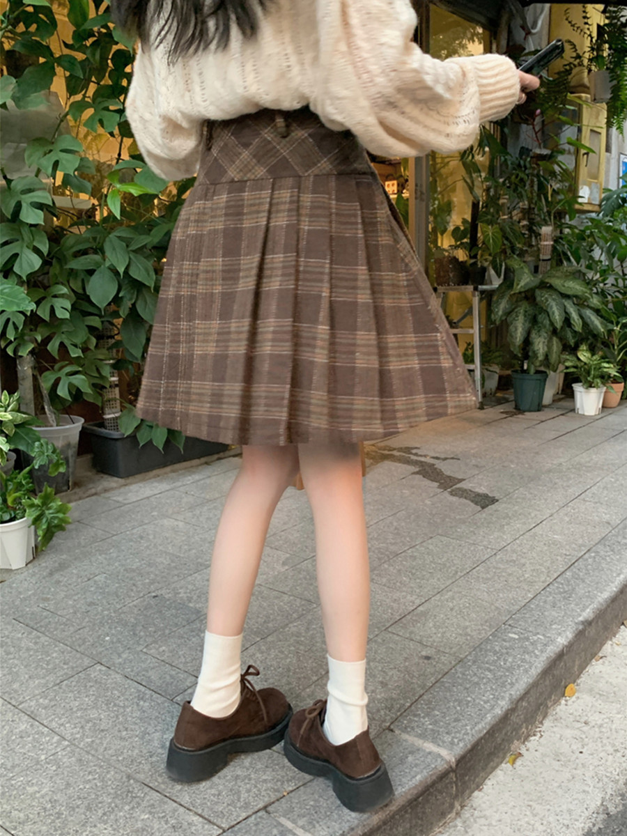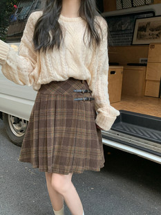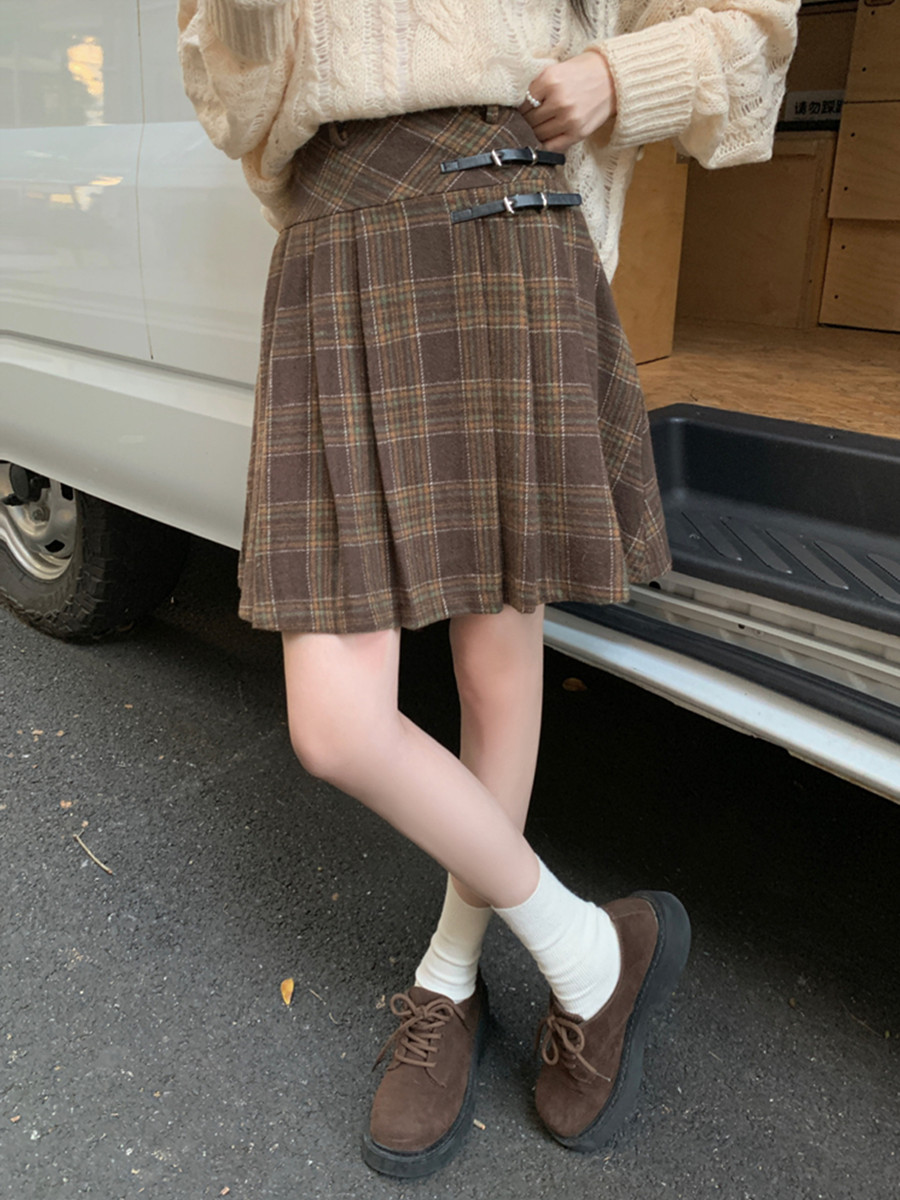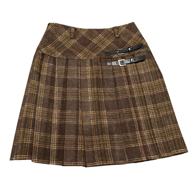 秋冬韩系高腰A字百褶裙女大码 皮扣设计复古格子毛呢半身裙中长款