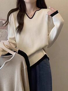 胖妹妹V领黑色毛衣打底衫 法式 T恤女秋冬设计感大码 正肩长袖 针织衫