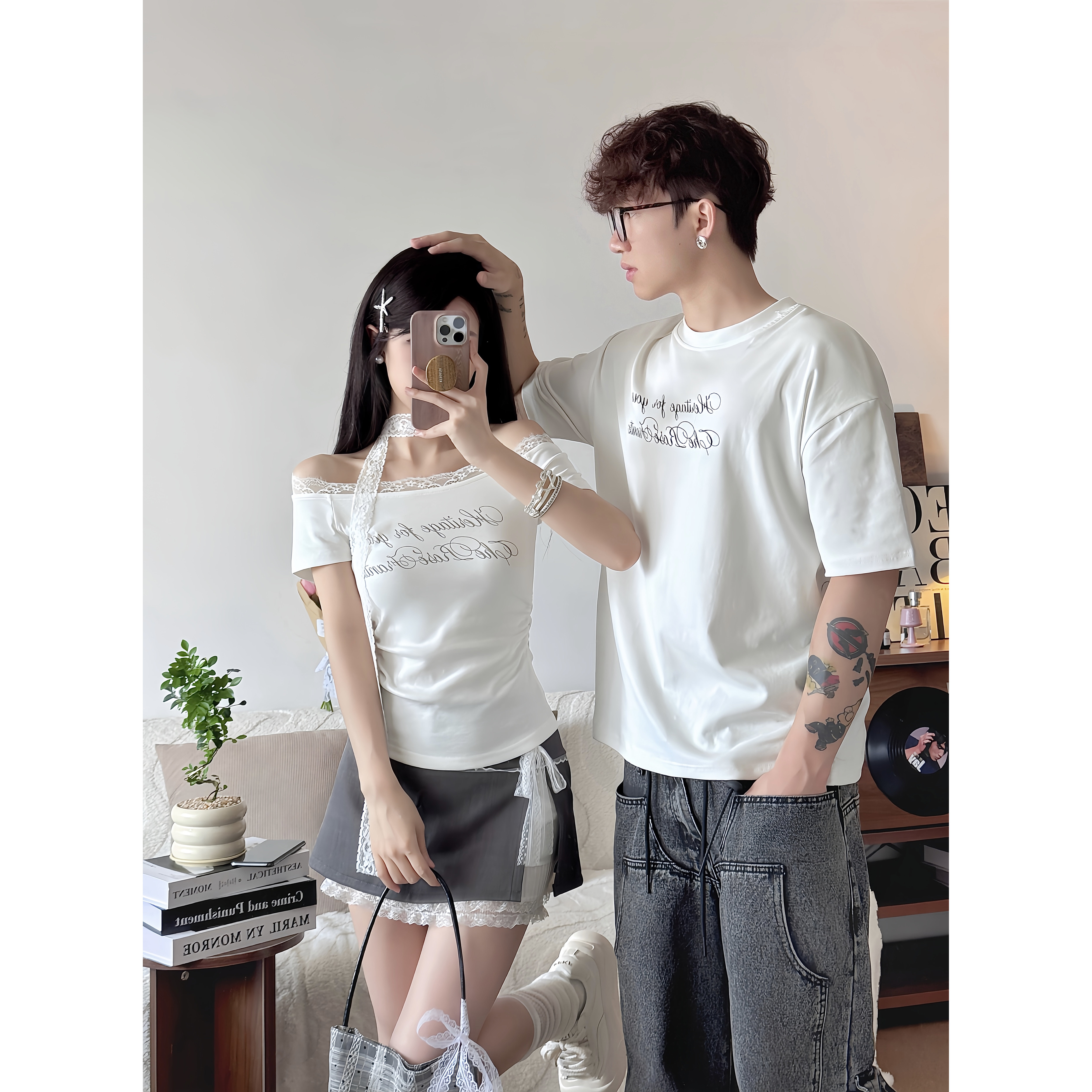甜辣风拼接蕾丝边一字肩印花短袖 一长一短2025新款 T恤 夏装 情侣装