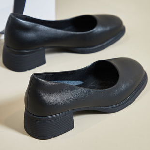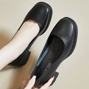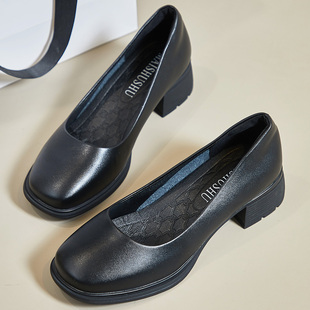 女浅口中跟 舒适工作鞋 方头3.8cm粗跟软底黑色皮鞋 女通勤软底单鞋