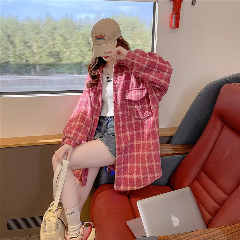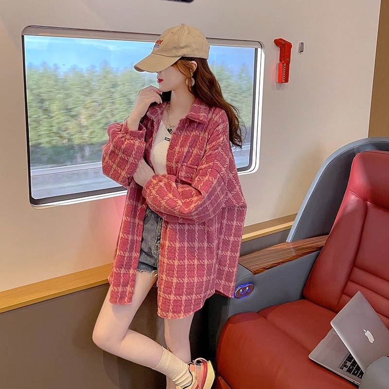 女装 宽松百搭衬衫 设计感格子开衫 韩版 上衣 外套女春秋新款 大码